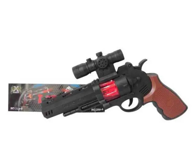 Электромеханический игрушечный пистолет выглядит почти как настоящее оружие! Все дело в реалистично выполненном прицеле. Револьвер оснащен световыми и звуковыми эффектами! Стоит спустить курок, как барабан и дуло начнут светиться. Особенно интересно стрелять из такого игрушечного оружия при приглушенном свете!