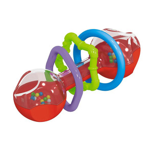 Игрушку в форме гантельки малышу не под силу взять в рот, поэтому она идеальна для его игр. Как бы ребенок не повернул погремушку, она будет всегда ему интересна. Оба конца гантельки снабжены наполнителем из мелких шуршащих шариков, за которыми ребенок может наблюдать. Старших малышей увлекут разъемные элементы на рукоятке погремушки.