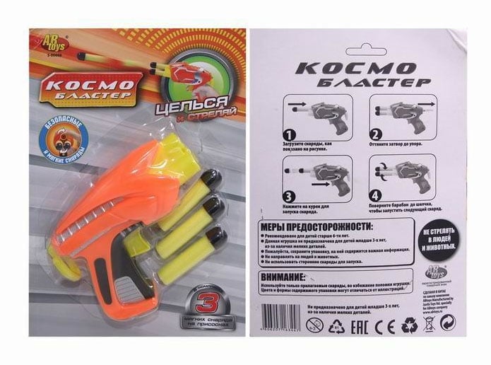 Космобластер, в наборе с 3 мягкими снарядами.Размер упаковки (д/ш/в): 23x15x6 см.