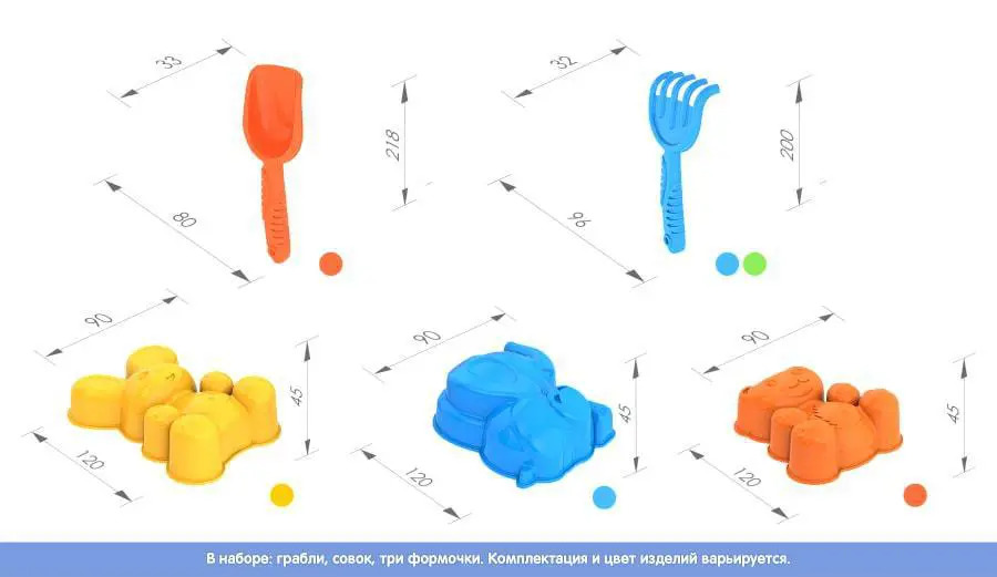 Комплектация: совок (арт. 090), грабли (арт. 091), 3 формочки "Зайка, Медведь и Слоник" (арт. 170)