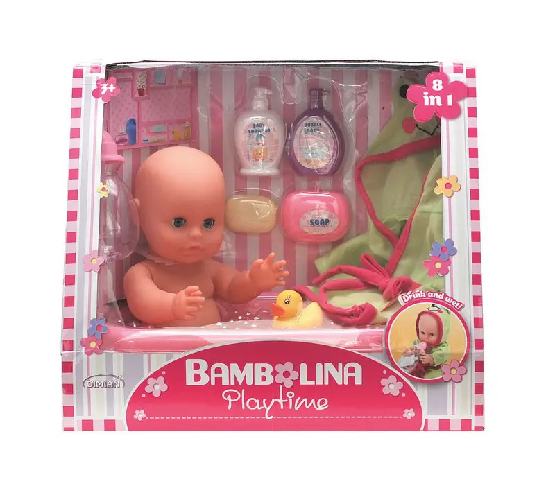 Кукла DIMIAN Bambolina PlayTime Пупс пьет и писает, с аксессуарами для купания (ванночка, бутылочки, халат), 33см