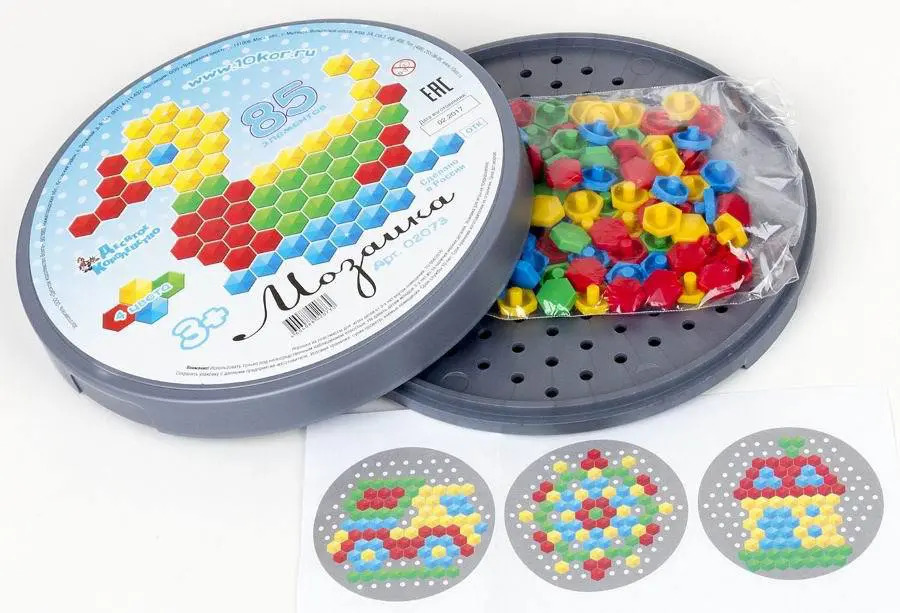 Мозаика пластмассовая детская шестигранная 85 элементов:- 4 цвета (красный, желтый, зеленый, синий);