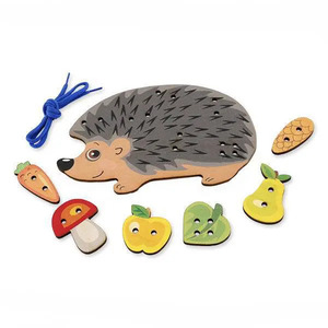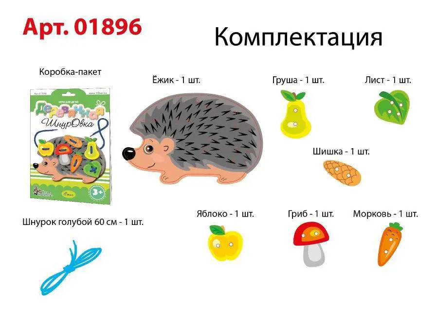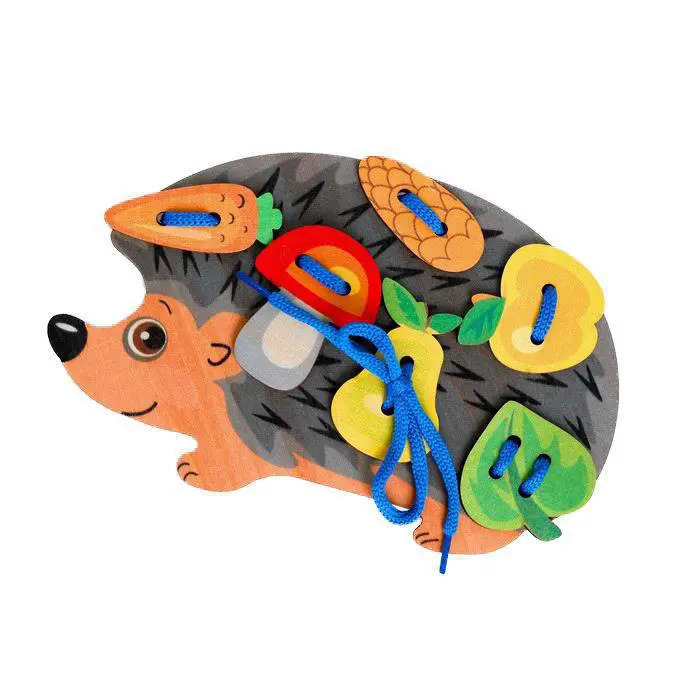 Ребенку предстоит при помощи шнурочка «пришить» к большому веселому ежику 6 элементов – яблоко, грибок, шишку, морковку, грушу и листик.