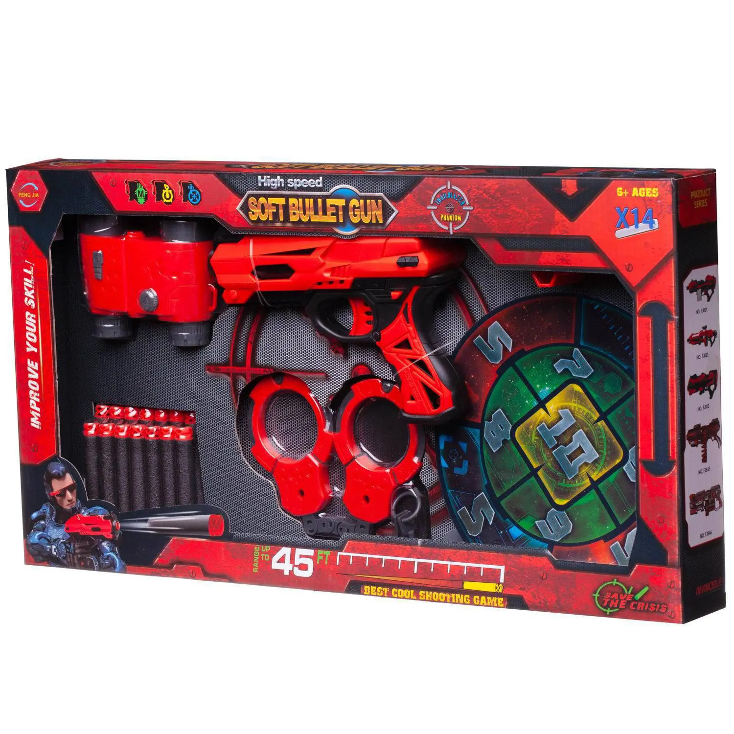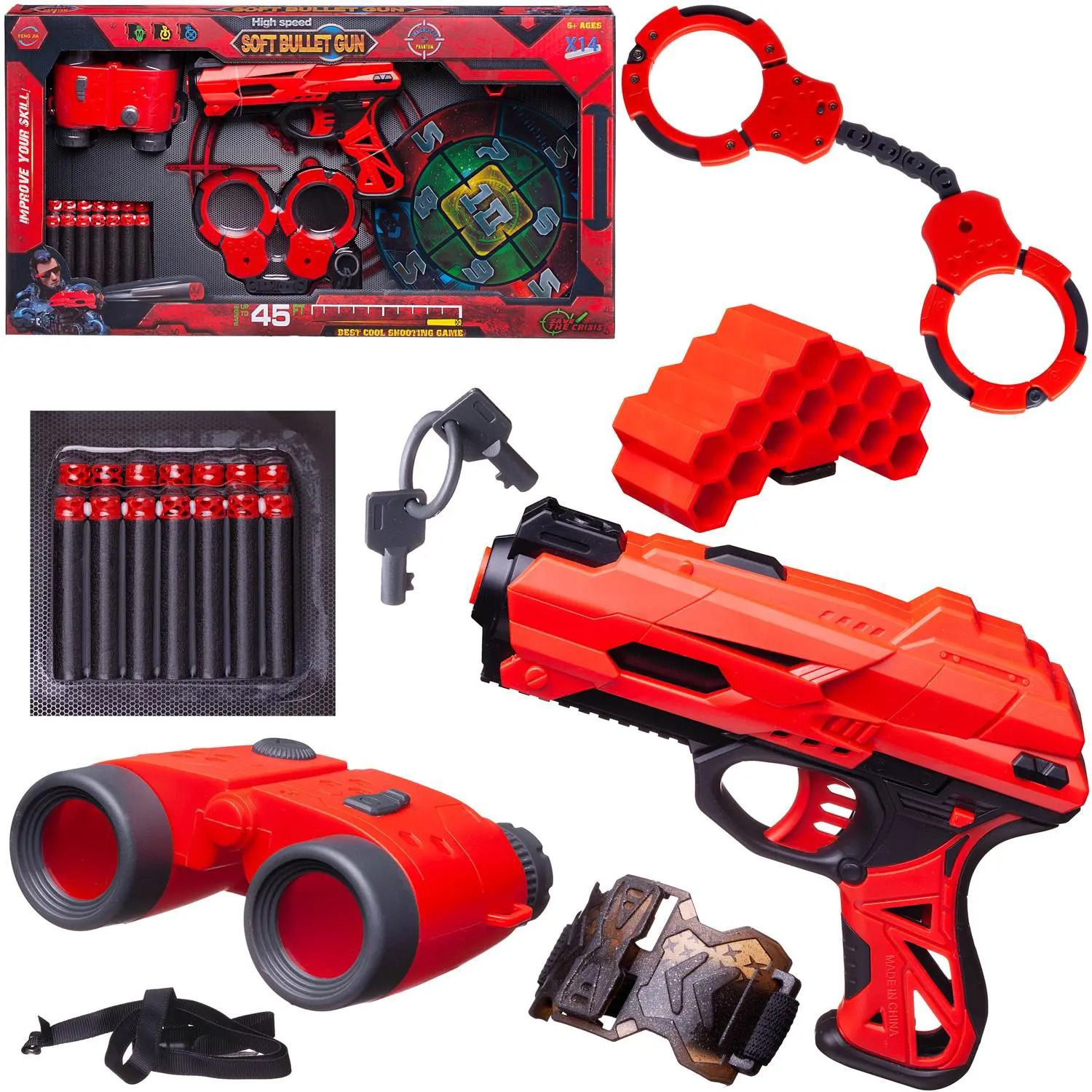 В наборе: бластер – 1 шт., мягкие снаряды -14 шт., мишень – 1 шт., бинокль – 1 шт., наручники – 1 шт., ключи – 2 шт., обойма – 1 шт., браслет – 1 шт.