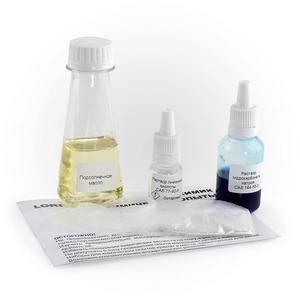 Подсолнечное масло, раствор лимонной кислоты, раствор гидрокарбоната натрия с красителем, перчатки, инструкция.