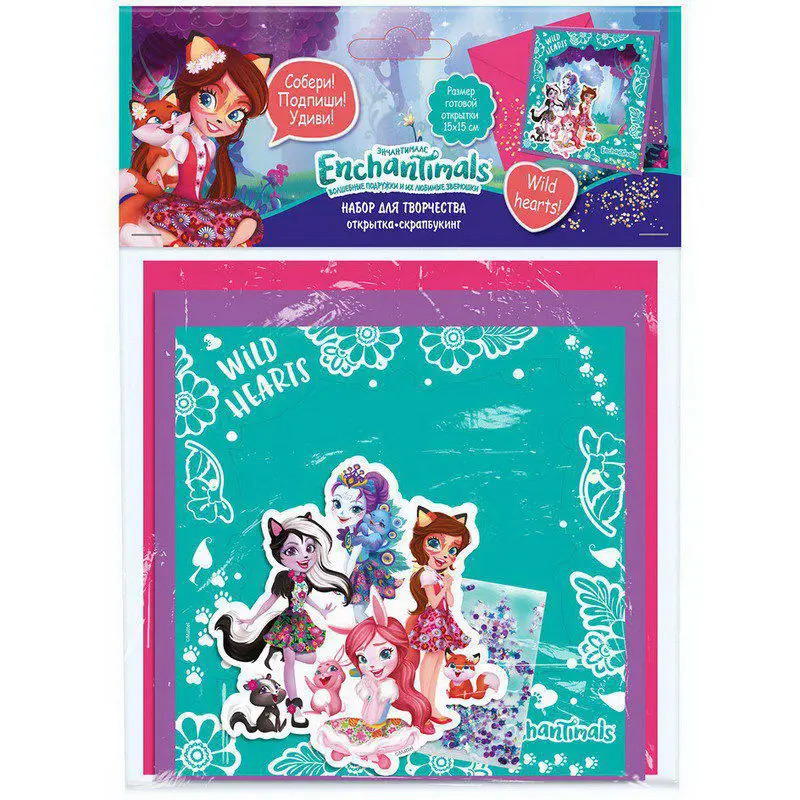 Открытка-скрапбукинг с волшебными подружками Энчантималс и их любимыми зверушками - это отличный подарок для девочек. Простой процесс создания открытки подарит истинное наслаждение от творчества, а яркие цвета и сверкающие блестки зарядят отличным настроением! В набор входит плотный конверт, карточка-основа, картинка-фон, рамочка, прозрачный пакетик, разноцветные блестки, фигурное изображение героинь, двусторонние самоклеящиеся подушечки и лента, инструкция.
