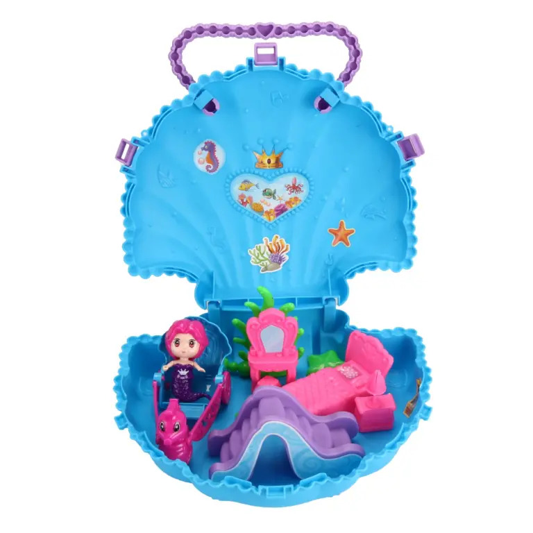Замечательный игровой набор «Домик для русалочки» из серии «В гостях у куклы» от бренда Abtoys покорит сердце любой маленькой девочки. Главный персонаж набора - фигурка русалочки с большими красивыми глазами, розовыми волосами, в фиолетовом чешуйчатом костюме с короной на груди. Она передвигается по подводному миру на карете, в которую запряжен морской конек. Дополняют набор предметы мебели, игровая горка и тематические наклейки. Сам домик оформлен в виде раскрывающейся ракушки. Он имеет удобную ручку, чтобы девочка могла взять набор с собой на прогулку или в любую поездку.Комплектность: домик-ракушка, фигурка русалочки, карета, кровать, трюмо, тумба, лампа, игровая горка, предметы морского дна – 4шт., наклейки.