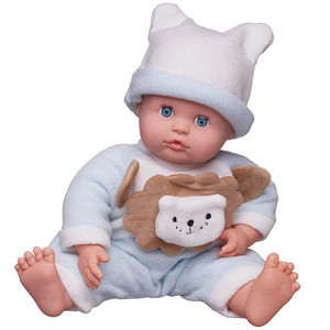 Очаровательная куколка-пупс будет отличным подарком для любой девочки. Она выглядит как настоящий малыш, имеет мягкое тело, ее так приятно прижимать к себе. Кукла-пупс одета в голубой комбинезон, украшенный объемной аппликацией в форме «Львенка», мягкую шапочку. У нее есть бутылочка. Кукла-пупс упакована в подарочную красивую коробку. Глазки у куклы не закрываются.Комплектность: кукла, бутылочка.