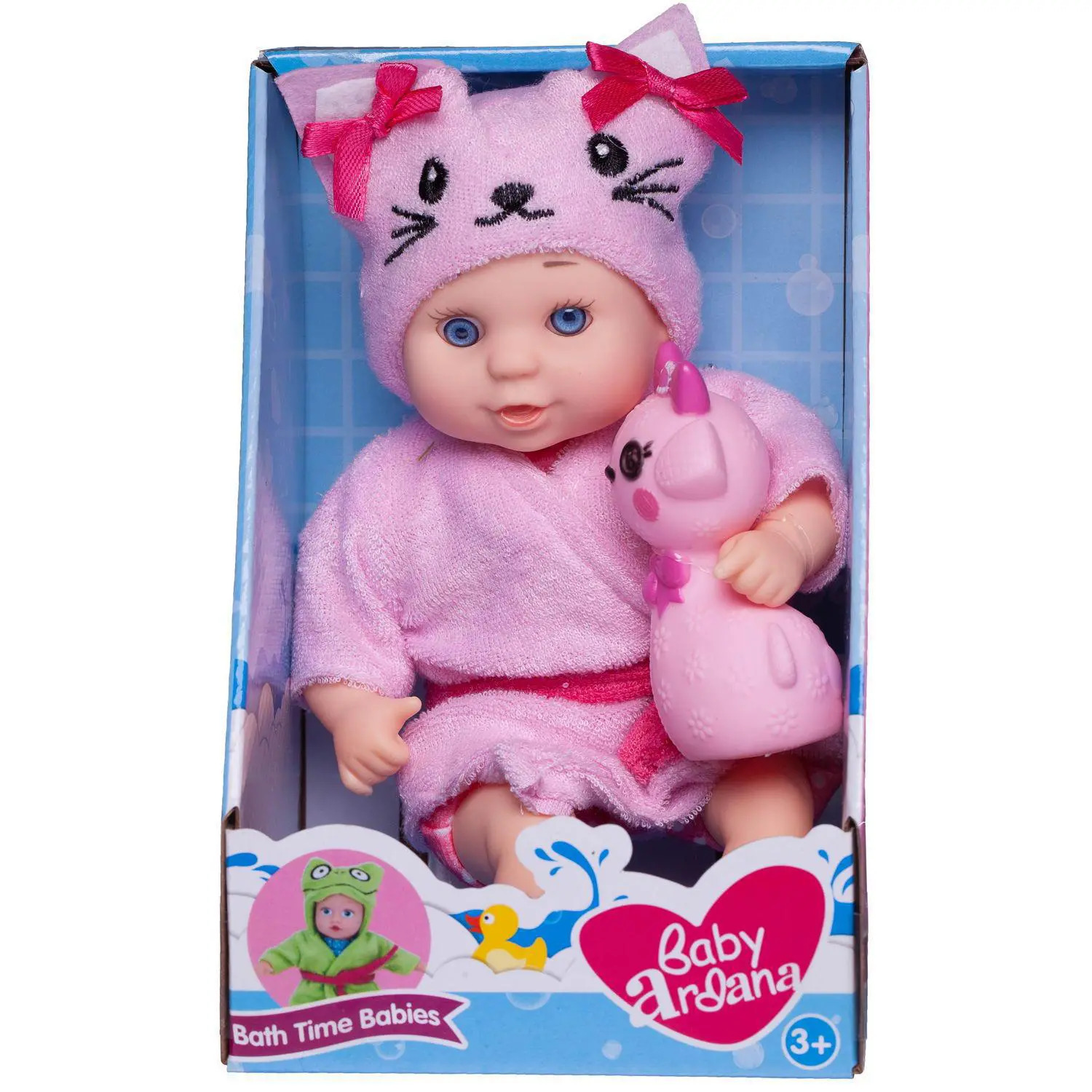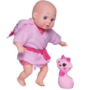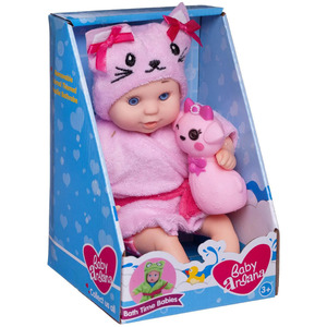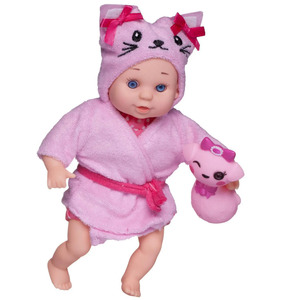 Этот очаровательный пупсик не оставит равнодушной ни одну девочку. Он одет в розовый халатик с поясом, а его капюшон похож на кошечку,В руках пупсика игрушка - Кошечка, с которой будет весело купаться в ванной.
