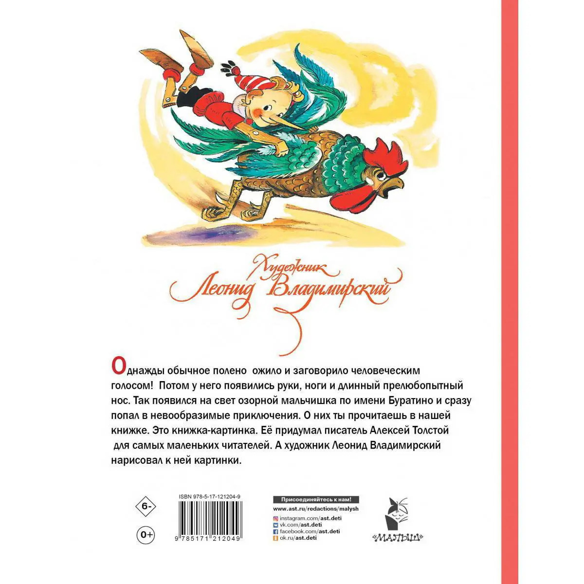 Книгу «Приключения Буратино, или Золотой ключик» Алексей Николаевич Толстой придумал специально для малышей. Художник Леонид Владимирский нарисовал к ней иллюстрации. В ней большие картинки и самые интересные приключения весёлого Буратино. Книга познакомит самых маленьких читателей с историей деревянного мальчишки. В 2020 году художнику книги Леониду Владимирскому исполняется 100 лет.Для дошкольного возраста.