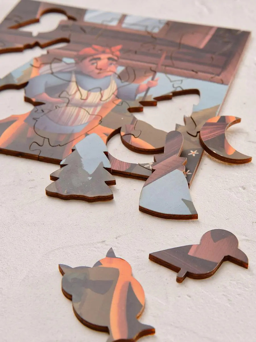 В лесу на опушке стоит избушка на курьих ножках. Избушка эта всем хорошо знакома, да и ее постоянная жительница тоже. Только вот уже давно хозяйка избушки сменила свой сварливый нрав на добрый и покладистый. Теперь в ее традициях важное место заняла стряпня по четвергам и угощение всех обитателей волшебного леса. Заходи и ты отведать бабушкиных пирожков с загадочной начинкой. Баба - Яга, очень предусмотрительная. Даже если ее метла сломалась, всегда есть запасные. А сколько их, Вы можете узнать, собрав пазл! Чтобы узнать верный ответ, напишите нам в Direct!Каждый набор индивидуален, состоит из уникальных тематических фигурок и деталей необычной сцепки по мотивам иллюстраций.После сборки предлагается разгадать зашифрованную загадку-головоломку, что делает наборы не только интерактивными, но также увлекательными и таинственными. Пазлы совмещают в себе развитие и творчество, учат играя, познавать и творить.Развивают творческие способности, концентрацию внимания, наглядно-образную память, мелкую моторику рук и учат принимать решения. Выполнены из экологически чистых пород дерева.За счет необычной мягкой упаковки удобно хранить и брать с собой в дорогу.