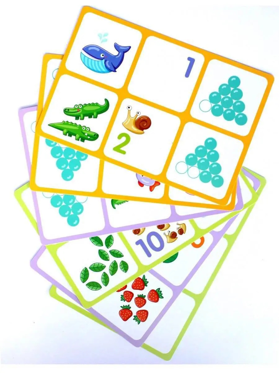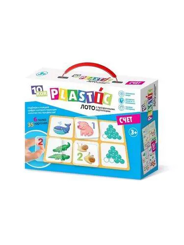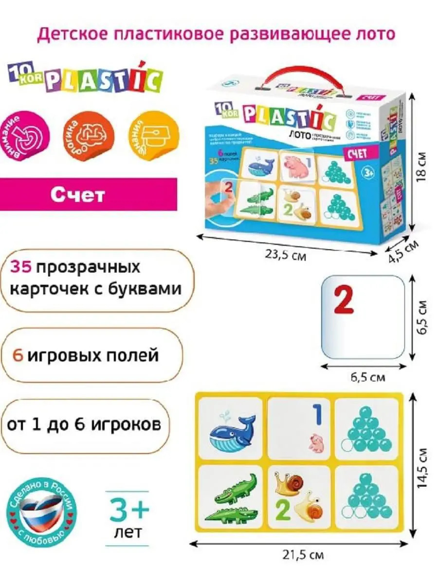 Лото для развития навыков счёта и классификации объектов. Состав игры: игровые поля (14,5 х 21,5 см) – 6 шт., прозрачные карточки с цифрами (6,5 х 6,5 см) – 35 шт. Материалы: картон, пластмасса. Для детей от 3 лет, от 1 до 6 человек. В каждой из 6 ячеек игрового поля изображены различные объекты – животные или абстракции – от 1 до 10 штук. Необходимо правильно подобрать прозрачные карточки с цифрами с картинками на игровом поле.