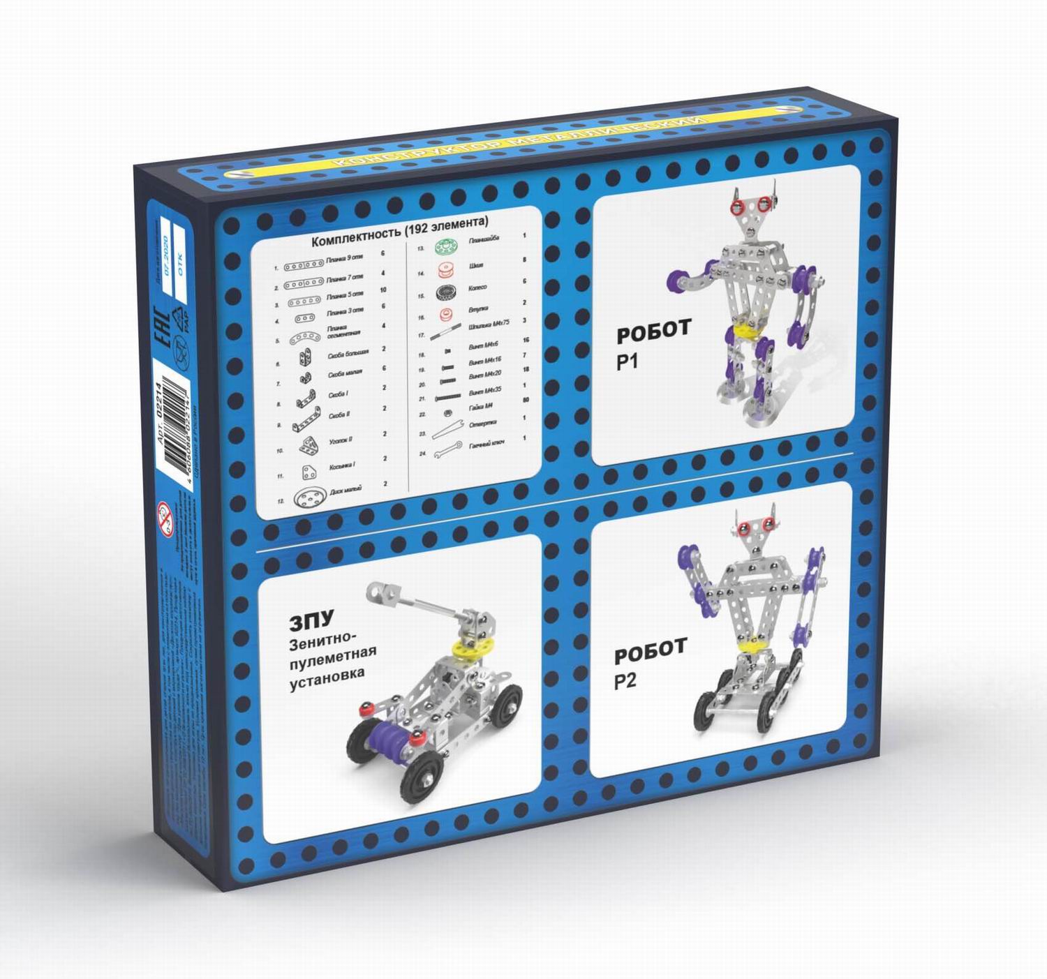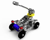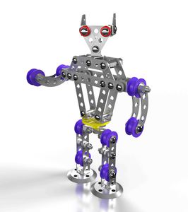 Из комплектующих данного набора можно собрать 3 модели с подвижными деталями: Робот Р1 (высота – 18 см), Робот Р2 на колёсах (высота – 16,5 см), Зенитно-пулемётная установка (высота – 12 см). Состав набора: планка с 9 отверстиями – 6 шт., планка с 7 отверстиями – 4 шт., планка с 5 отверстиями – 10 шт., планка с 3 отверстиями – 6 шт., полукруглая планка с 5 отверстиями – 4 шт., узкая планка с бортиками – 6 шт., средняя планка с бортиками – 2 шт., широкая планка с бортиками – 2 шт., узкая планка с высокими бортиками – 2 шт., планка-уголок с 3 отверстиями – 2 шт., пластмассовое колесо – 6 шт., пластмассовый диск – 1 шт., пластмассовые гайки – 8 шт., пластмассовые кольца – 2 шт., винт М4 х 6 – 22 шт., винт М4 х 16 – 7 шт., винт М4 х 8 – 3 шт., винт М4 х 20 – 20 шт., винт М4 х 35 – 1 шт., гайки металлические – 80 шт., отвёртка – 1 шт., ключ гаечный – 1 шт., металлическая спица – 3 шт., планка-уголок – 2 шт., круглая планка с 5 отверстиями – 2 шт., инструкция со схемой сборки. Развивает конструкторские навыки у ребёнка, а также обучает основам моделирования. Занятия с металлическим конструктором развивают усидчивость, мелкую моторику рук, логическое и пространственное мышление.