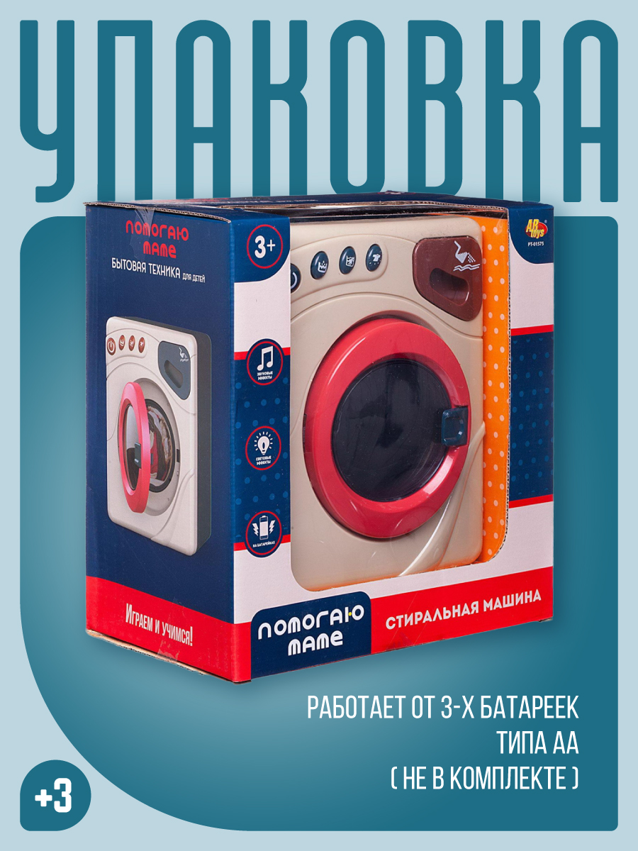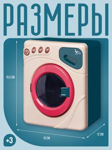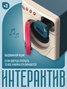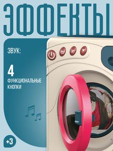 Стиральная машина обязательно понравится юным хозяйкам и будет отличным тренажером для обучения ребенка! Реалистичный дизайн, функциональные кнопки, выдвижной ящик для стирального порошка, вращающийся барабан, световые и звуковые эффекты сделают игровой процесс еще более интересным и реалистичным.КАК ИГРАТЬ? Установите батарейки. Выберите один из трех режимов на панели управления, каждый из них работает в своем ритме и имеет свою скорость вращения барабана. Активируйте игрушку, нажав на кнопку «Старт».