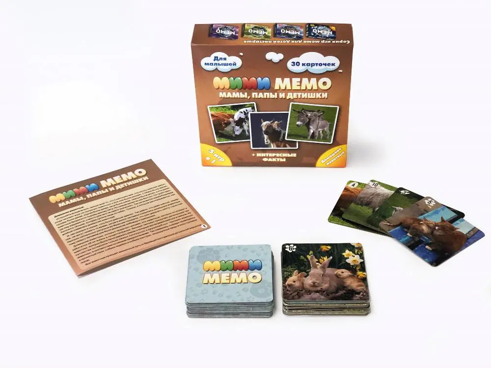"МиМи Мемо" - познавательная игра для тренировки визуальной памяти, расширения кругозора и словарного запаса. Она поможет развить внимательность и умение сопоставлять и сравнивать. Игра научит детей не только отличать одних животных от других, но и запомнить, как называются звериные семьи. Как "зовут" маму папу и детеныша. В наборе 30 карточек из плотного картона с парными изображениями. Также в комплекте буклет-инструкция с описанием семей, забавных фактов и привычек животных, изображенных на карточках.С помощью нашего набора Вы можете поиграть в 5 различных игр: