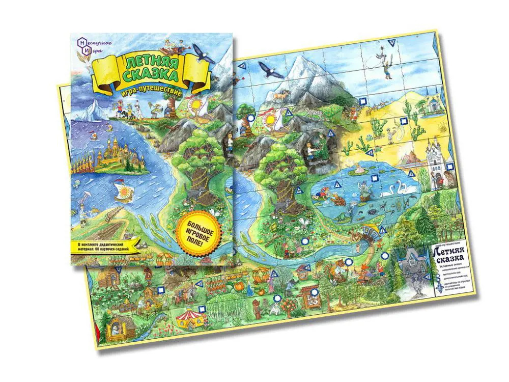 Очередность ходов игроков определяется с помощью считалочки или броска кубика. Количество ходов по полю определяется броском кубика. На поле могут встретиться условные значки изменения хода игры (например, пропустить ход, пройти назад или вперед на определенное количество ходов). Выиграет тот, кто первый дойдет до кукольного театра «Молния». Игра «Летняя сказка» поможет детям провести познавательно свободное время. Но без помощи взрослого им не обойтись. В игре использованы сюжеты сказок «Буратино», «Винни-пух и все, все, все», «Кощей Бессмертный», «Маша и медведь», «Волк и семеро козлят», «Три поросенка», «Золушка», «Микула Селянинович и Вольга», «Курочка Ряба», «Баба Яга», «Царевна Лягушка», «Илья Муромец», «Кот в сапогах», «Сказка о рыбаке и рыбке», «Руслан и Людмила», «Садко», «Русалочка», «Конек-Горбунок», «Сказка о царе Салтане», «Малахитовая шкатулка», «Летучий корабль», «Дюймовочка», «Гадкий утенок», «Аленький цветочек», «Волшебная лампа Алладина», «Али-баба и сорок разбойников», «Старик Хоттабыч», «Фаэтон – сын Солнца». Если ребенок не знаком с сюжетом сказки, расскажите ему или предложите вместе почитать книгу. Помогите ребенку отыскать всех героев сказок. Предложите ребенку ответить на вопрос, почему та или иная ситуация на карте вызывает ускорение или замедление хода.