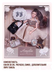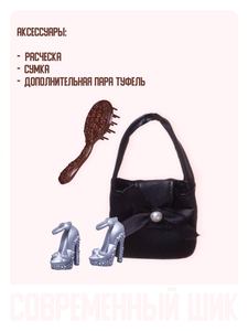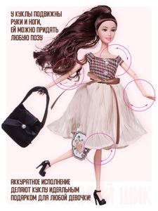 Кукла выглядит как красивая молодая девушка, которая разбирается в новинках моды и любит следить за собой. Ребенок, играя с такой куклой, придумает разные сюжеты, в которых он использует все наряды для игрушечной подружки. Также в наборе имеются модные аксессуары. У куклы подвижны части тела, благодаря чему в процессе игры девочка сможет менять положение игрушки.Комплектность: кукла, расческа, сумка, дополнительная пара туфель.