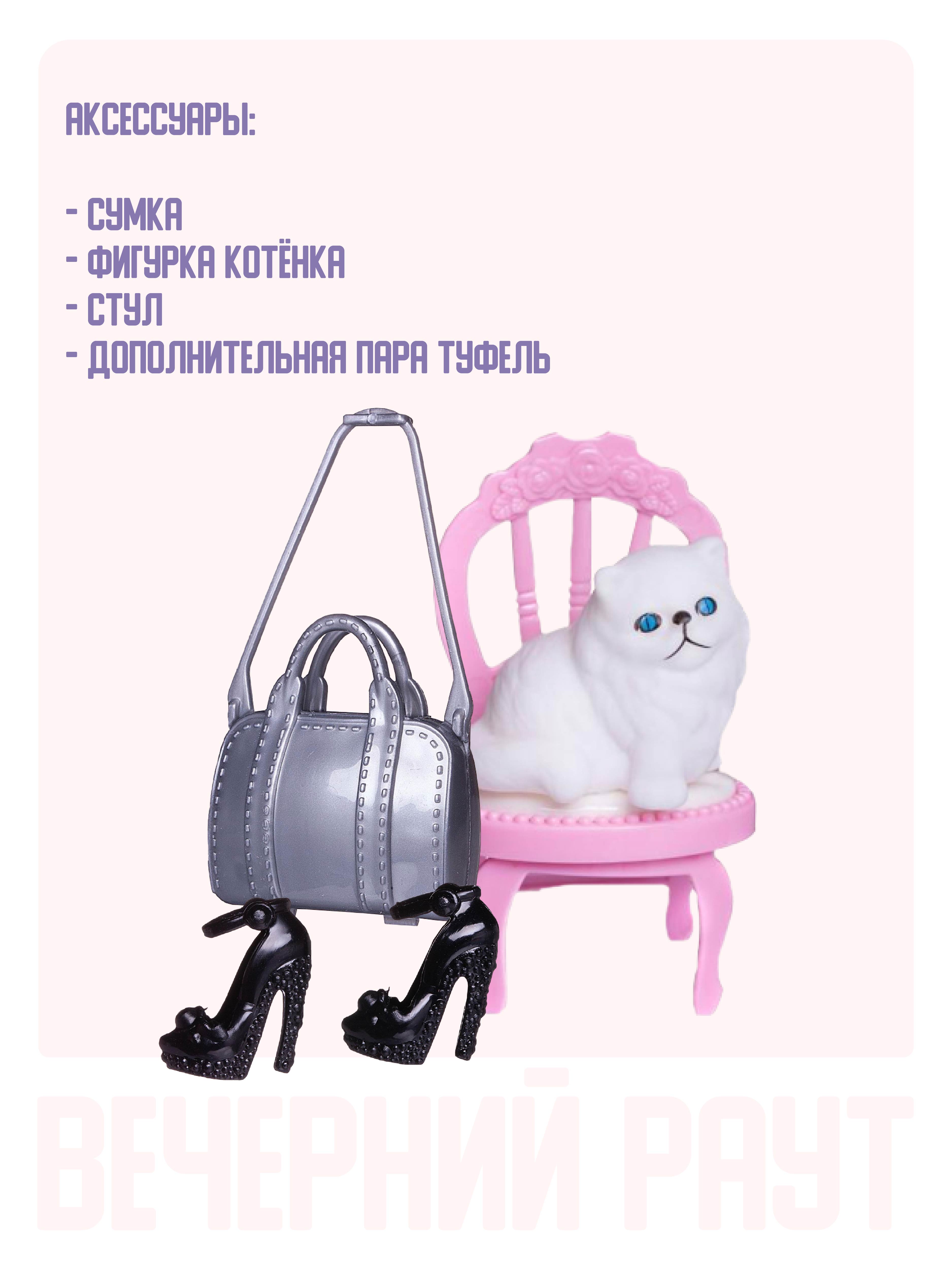 Кукла выглядит как красивая молодая девушка, которая разбирается в новинках моды и любит следить за собой. Ребенок, играя с такой куклой, придумает разные сюжеты, в которых он использует все наряды для игрушечной подружки. Также в наборе имеются модные аксессуары. У куклы подвижны части тела, благодаря чему в процессе игры девочка сможет менять положение игрушки.Комплектность: кукла, фигурка котенка, стул, сумка, дополнительная пара туфель.