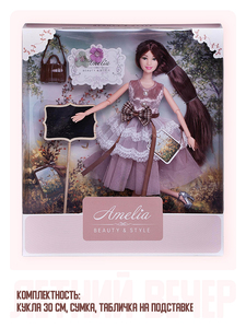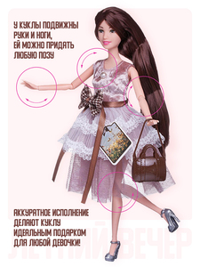Кукла выглядит как красивая молодая девушка, которая разбирается в новинках моды и любит следить за собой. Ребенок, играя с такой куклой, придумает разные сюжеты, в которых он использует все наряды для игрушечной подружки. Также в наборе имеются модные аксессуары. У куклы подвижны части тела, благодаря чему в процессе игры девочка сможет менять положение игрушки.Комплектность: кукла, сумка, табличка на подставке.