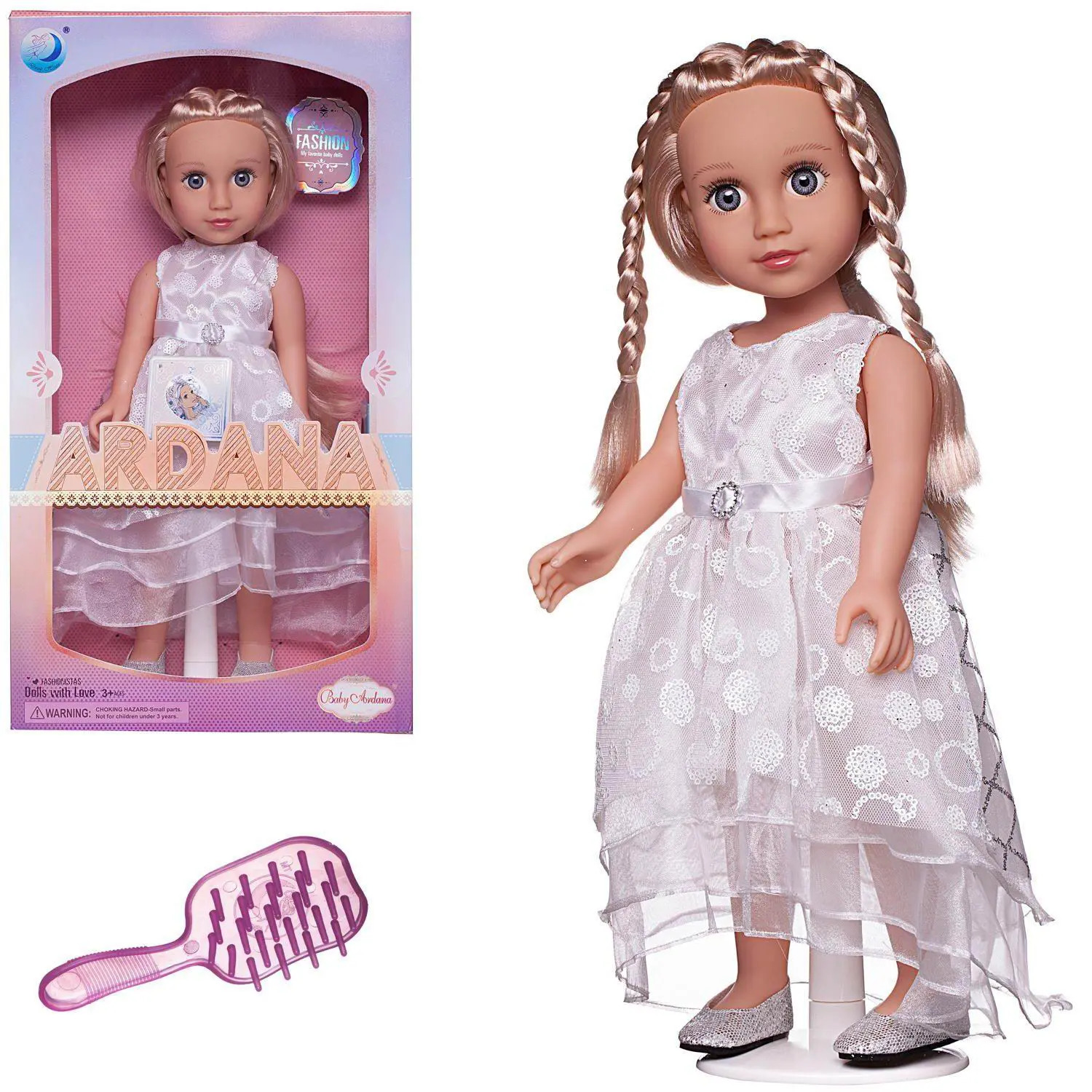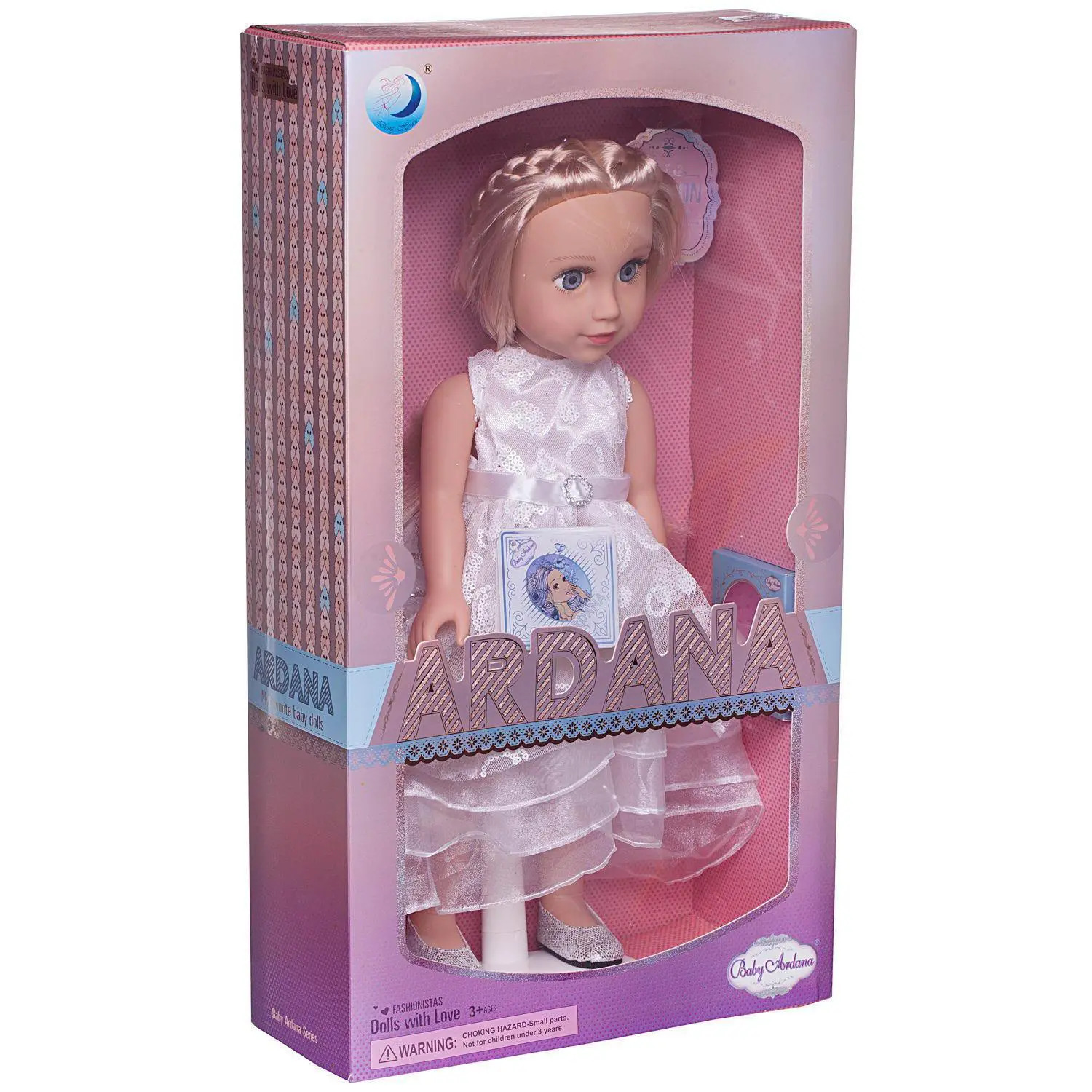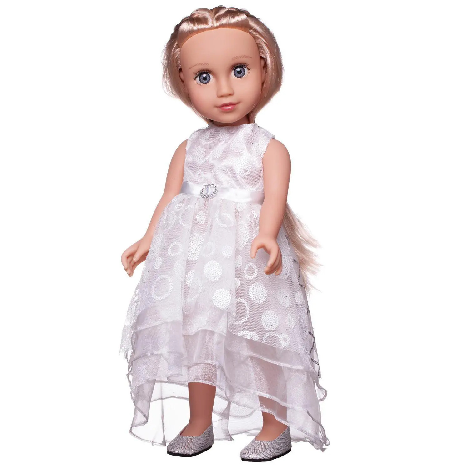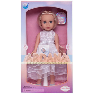 Очаровательная кукла "Baby Ardana" станет отличным подарком для любой девочки. Кукла имеет миловидную внешность, длинные, густые, светлые волосы. Она одета в роскошное, длинное, белое платье с воздушной многослойной юбкой. Линия талии оформлена атласной лентой с красивой пряжкой по центру. Играя с куклой, девочка будет придумывать различные сюжеты, развивать фантазию и чувство стиля.Высота куклы 45 см. Глаза не закрываются.