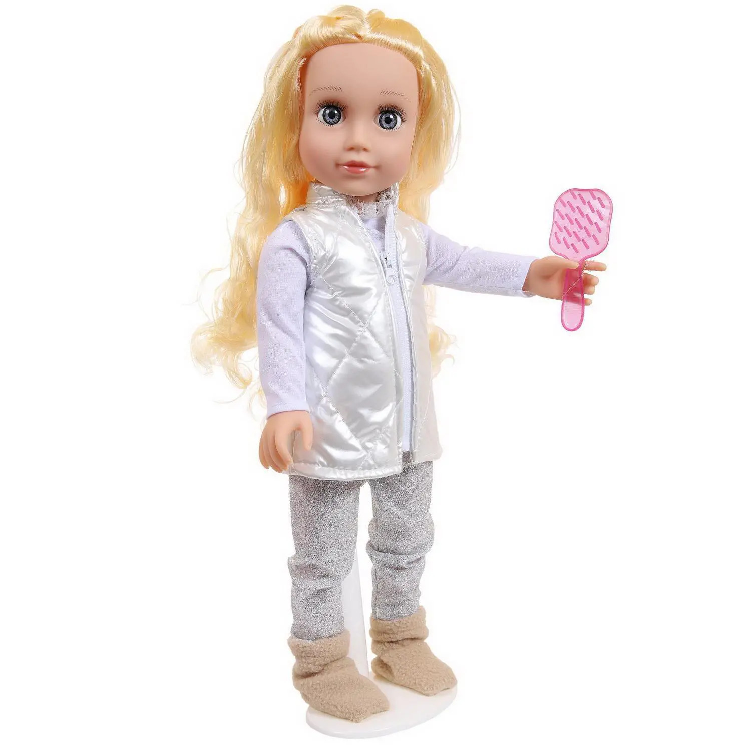 Очаровательная кукла "Baby Ardana" станет отличным подарком для любой девочки. Кукла имеет миловидную внешность, длинные, густые, светлые волосы. На ней одета стильная современная одежда: белая кофточка с аппликацией из серебряных пайеток в форме сердца, серебристые брюки, кремовая жилетка на молнии, зимние сапожки. Играя с куклой, девочка будет придумывать различные сюжеты, развивать фантазию и чувство стиля.Высота куклы 45 см. Глаза не закрываются.