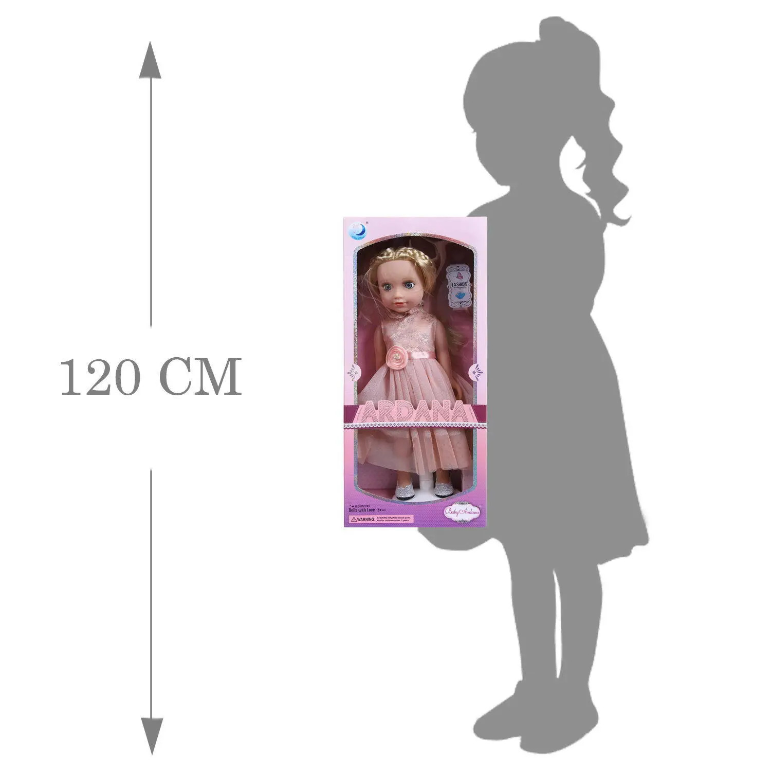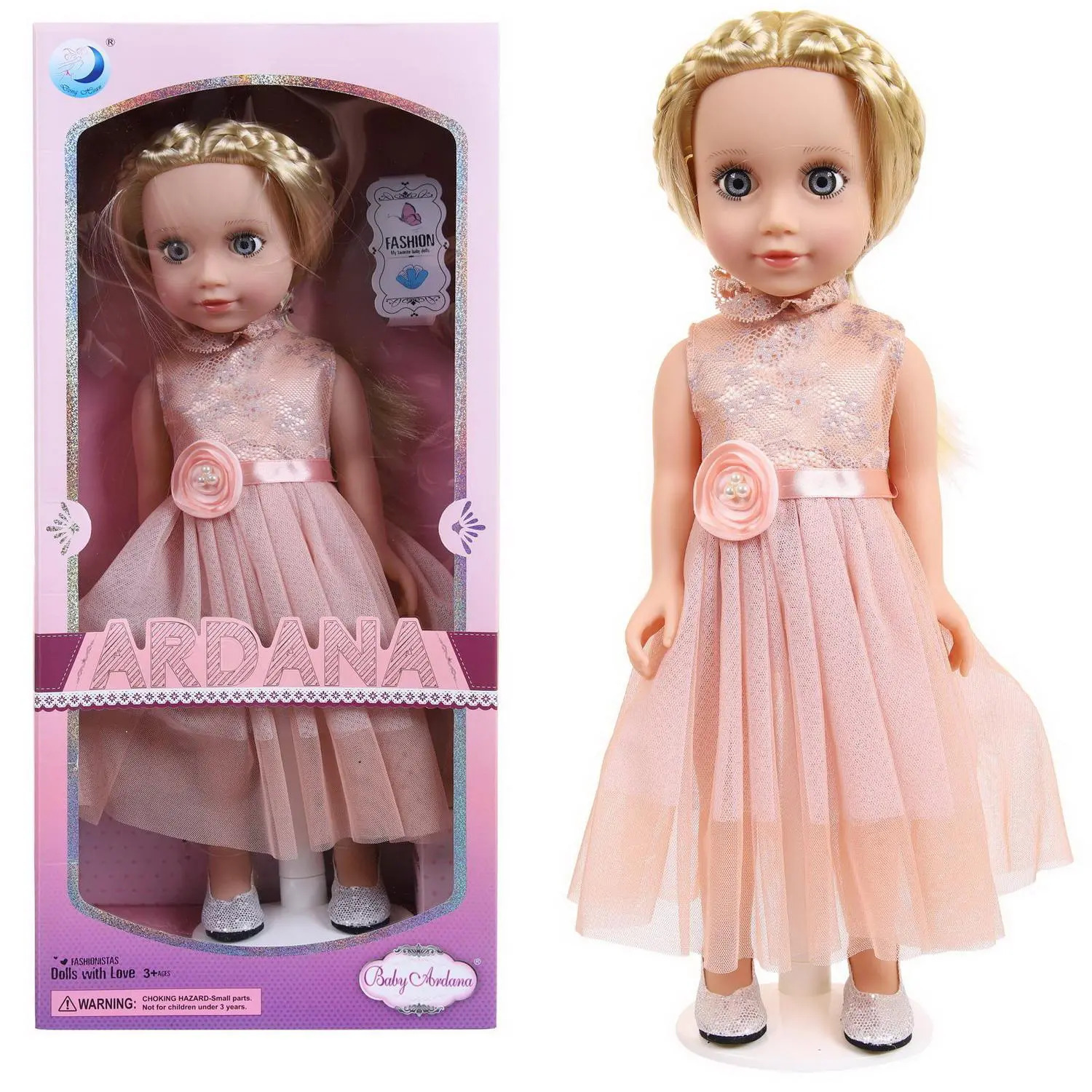Эта очаровательная кукла "Baby Ardana" станет отличным подарком для любой девочки. Кукла имеет миловидную внешность, длинные, густые, светлые волосы Она одета в роскошное, длинное платье персикового цвета. Его верхняя часть с ажурным воротничком сшита из рельефной плотной ткани, нижняя часть представляет собой воздушную, многослойную юбку. Линия талии оформлена атласной лентой. К ней прикреплена аппликация в виде цветка с тремя жемчужинами в центре. Играя с куклой, девочка будет придумывать различные сюжеты, развивать фантазию и чувство стиля.Высота куклы 45 см. Глаза не закрываются.