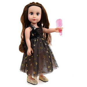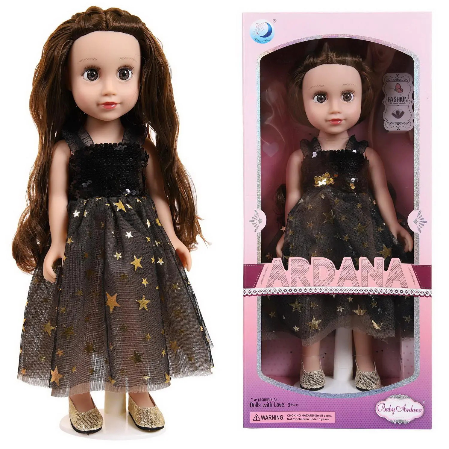 Эта очаровательная кукла "Baby Ardana" станет отличным подарком для любой девочки. Кукла имеет миловидную внешность, длинные, густые, каштановые волосы. Верх платья расшит темными пайетками, нижняя часть платья – воздушная многослойная юбка, усыпанная золотыми звездочками. На ногах куклы обуты золотые туфельки. Играя с куклой, девочка будет придумывать различные сюжеты, развивать фантазию и чувство стиля.Высота куклы 45 см. Глаза не закрываются.