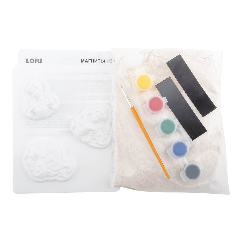 Комплектация: Гипс 200 гр., форма для 3 магнитов, магнитная лента, краска, кисть, инструкция.