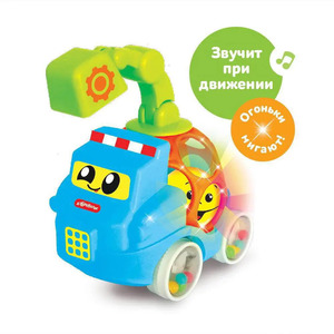 Чудо-машинка для самых маленьких – с мячиком в кузове! Она звучит при движении! Малыш будет катать экскаватор – и слушать веселые песенки («Бибика», «Песенка про счет», «Гудят машины»), мелодии и звуки транспорта. Колесики звенят, как погремушка, огоньки мигают, ковш двигается, а мягкий кузов так приятно потрогать пальчиками!Игра с этой машинкой развивает у ребенка музыкальные способности, двигательную активность, тактильные ощущения.