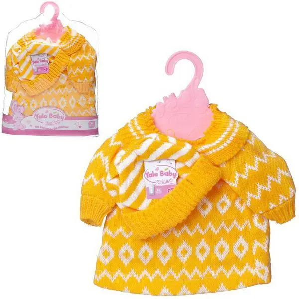 - Комплект представлен платьем и шапочкой яркой желто-белой расцветки для любимой куколки Вашей дочери.