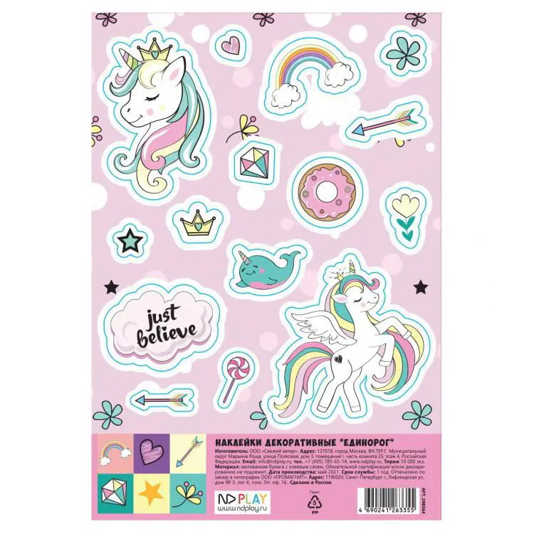 Декоративные наклейки "Единорог" с любимыми героями. Продукция сделана из высококачественных материалов и отличается высоким качеством изображения и яркостью цветопередачи. Такой набор наклеек позволит сделать любимые вещи ребенка уникальными - можно украсить комнату, тетради и игрушки. Польза игр с наклейками: - развитие мелкой моторики и укрепление мышц рук; - развитие двусторонней координации рук: одной рукой необходимо держать бумажное основание, а второй снимать наклейку; - развитие воображения и фантазии. Декоративные наклейки "Единорог" – это коллекция ярких стикеров, которая собрана специально для детей и их родителей!