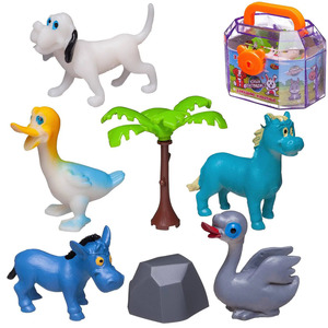 Комплектность: фигурки мультяшных домашних животных – 5 шт., пальма - 1шт., горка ландшафтная- 1шт., чемоданчик – 1шт., ключик - 2 шт.
