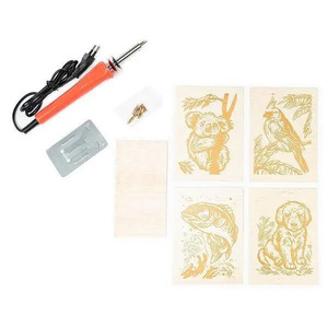 Набор для выжигания по дереву (аппарат с насадками, доски 5 шт). Состав:аппарат для выжигания по дереву (пирограф)— 1 шт. (длина прибора 23 см., длина шнура 90 см.), подставка под аппарат – 1 шт. (5х8 см.), фигурные насадки для нанесения изображений различной сложности — 5 шт. (1,6 см), доска с нанесённым рисунком (коала, собака, птица, рыба) самолёт - 4 шт. (21х15 см., толщина 3 мм.), доска без рисунка (пробная) – 1 шт. (21х11 см., толщина 3 мм.)Технические характеристики: