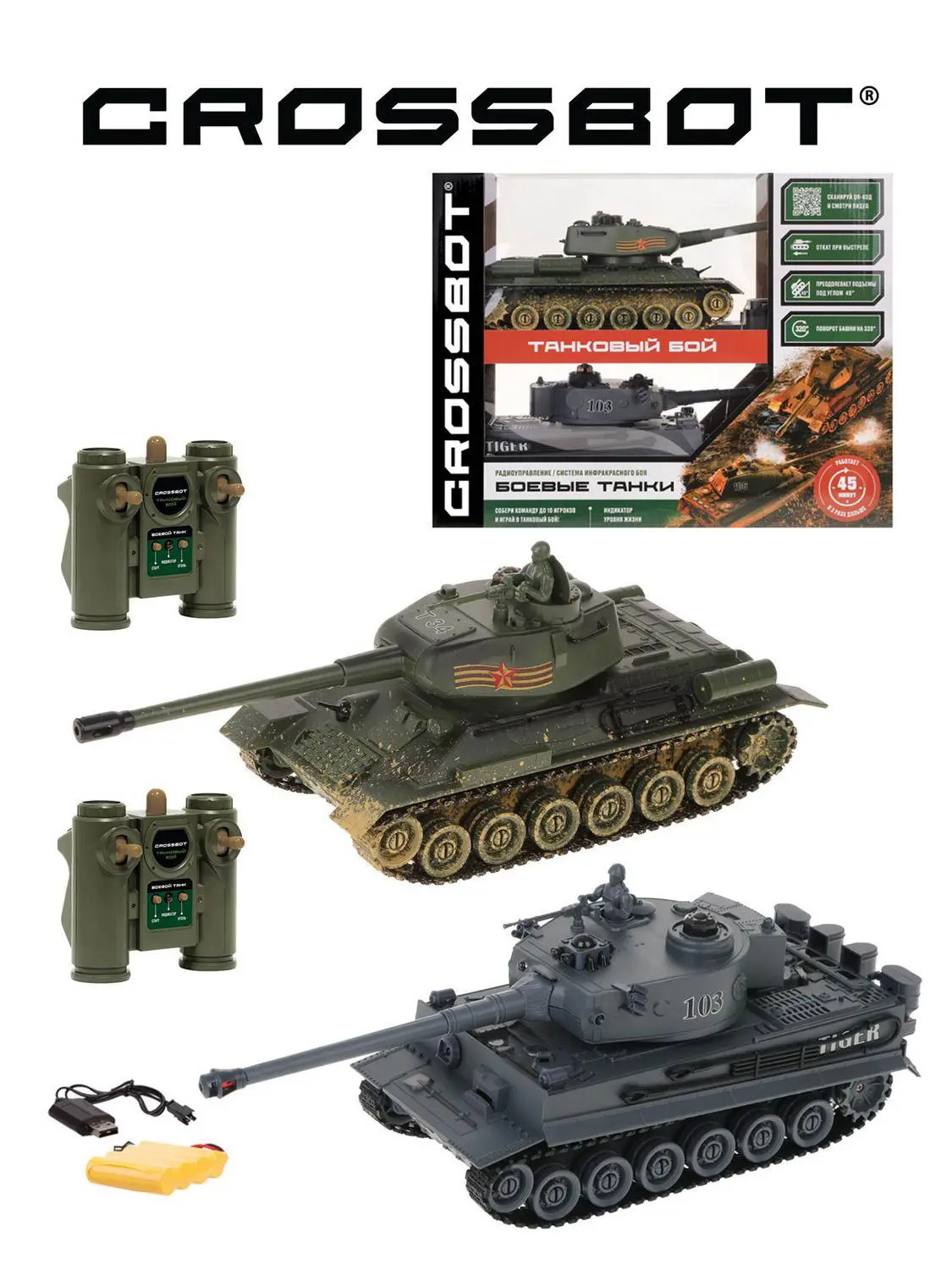Р/у модели танков Т-34 (СССР) и Tiger (Германия) с системой ИК-боя в масштабе 1:24. Осуществляют движение вперёд/назад,повороты вправо/влево, подъёмы под углом 45°, круговое вращение на месте и поворот башни вправо/влево на 320°. Предусмотрены демонстрационный режим и автоотключение. При покупке 2-х и более танков ТМ "Пламенный мотор" и "CROSSBOT" вы получаете возможность командной игры в танковый бой до 10-ти игроков одновременно.