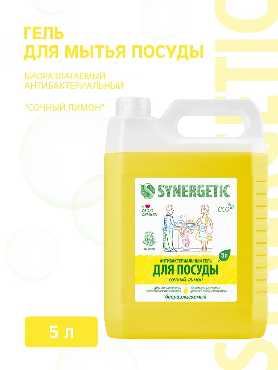 SYNERGETIC Гель для мытья посуды "Сочный лимон" антибактериальный, биоразлагаемый, 5л