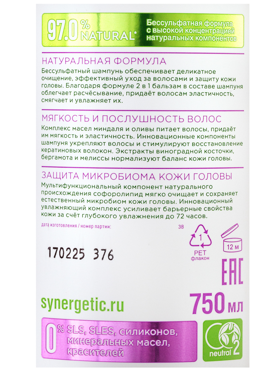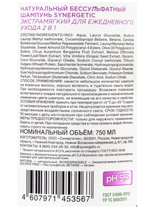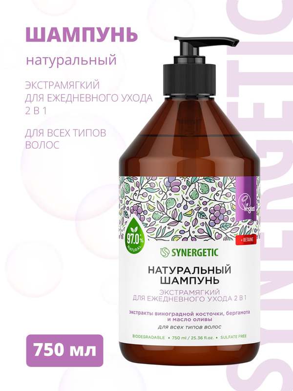 SYNERGETIC Натуральный шампунь и бальзам "Экстрамягкий для ежедневного ухода" 2в1, бессульфатный, 750мл