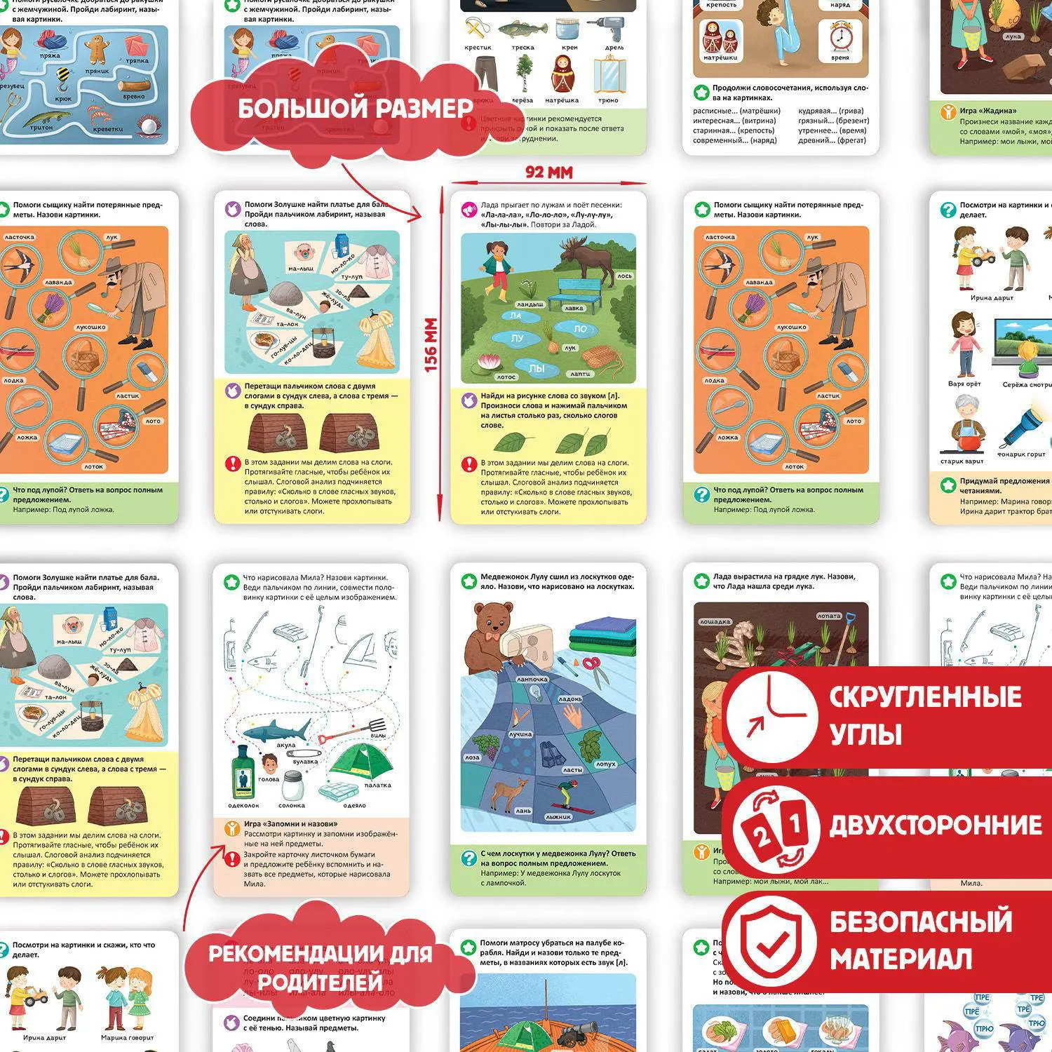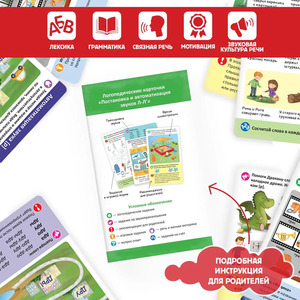 Наборы «Логопедические карточки» от торговой марки Malamalama — это 8 наборов по 21 двусторонней карточке, 60-90 уникальных заданий в каждом наборе. В их разработке участвовала практикующий педагог-логопед. Карточки направлены на запуск речи, постановку и автоматизацию различных сложных для произношения малышами звуков. Карточки выполнены из мелованного картона, они блестящие и яркие: все задания сопровождаются красочными иллюстрациями. Внутри каждой коробки есть подробная инструкция для родителей. Размер карточек: 92x156 мм.