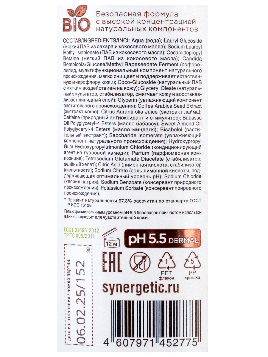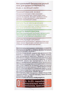 Натуральный биоразлагаемый гель для душа SYNERGETIC «Кофе и зеленый лайм» — это деликатное средство для очищения кожи, на 99,1% состоящее из натуральных компонентов. Гипоаллергенный аромат геля SYNERGETIC «Кофе и зеленый лайм» разработан в швейцарском доме Givaudan с использованием натуральных эфирных масел кедра, пачули и бархатцев.Натуральный экстракт кофе оказывает тонизирующее действие, подтягивает кожу и делает ее упругой. Экстракт зеленого лайма повышает сопротивляемость кожи вредным факторам окружающей среды. Софоролипид из рапсового масла мягко очищает и сохраняет естественный микробиом кожи.