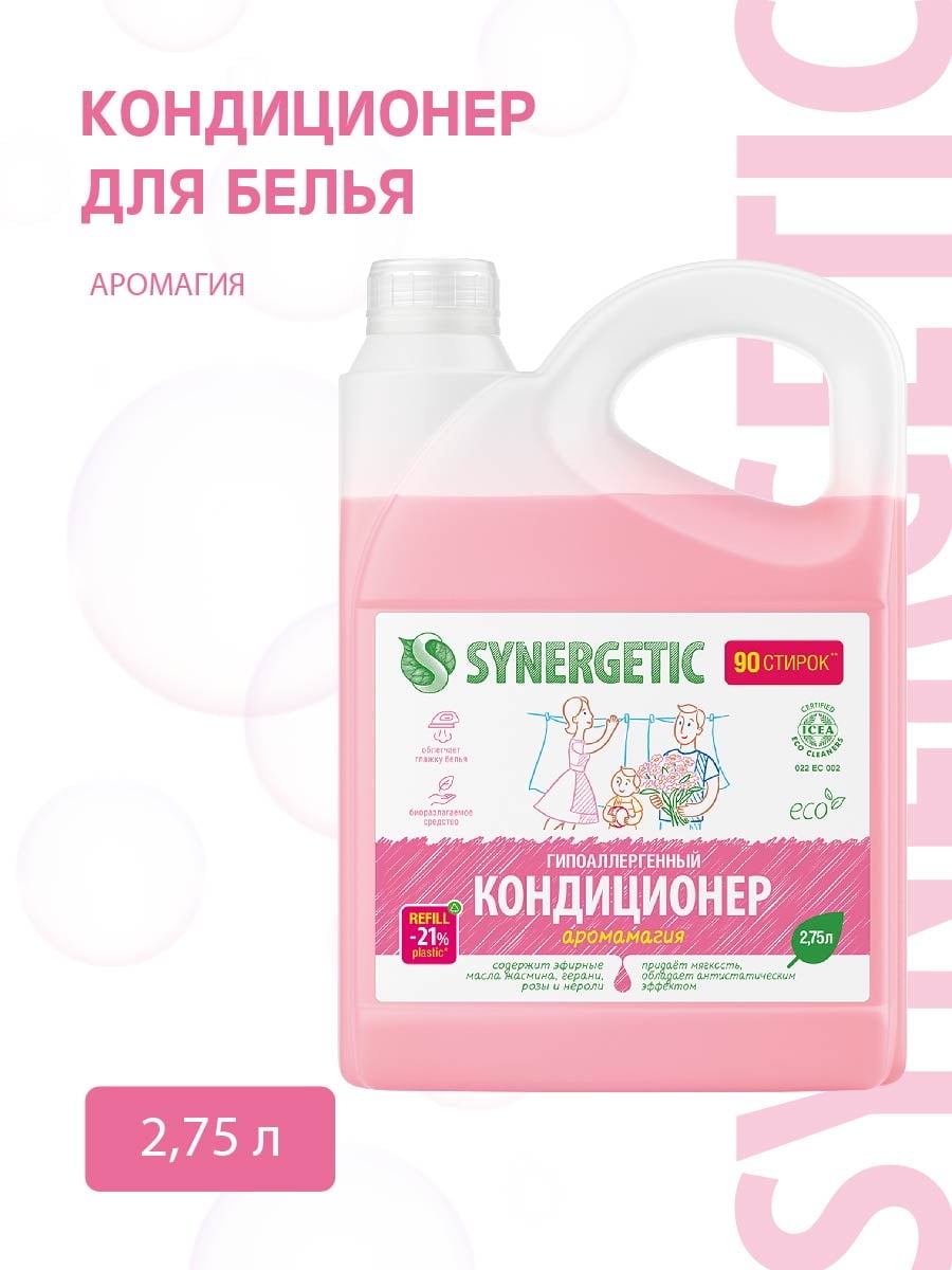 Сейчас объясним, к чему это мы. Средство для стирки обеспечивает чистоту, но именно кондиционер незаметно повышает качество жизни каждый день: смягчает ткань, придает аромат свежести, облегчает глажку и дает антистатический эффект. Вспомните ощетинившиеся махровые полотенца, которые стоят колом после высыхания — огрубевшая ткань хуже впитывает влагу и раздражает кожу. Кондиционер SYNERGETIC справляется со своей задачей даже в жесткой воде и заботится о вашем хорошем настроении каждый день.