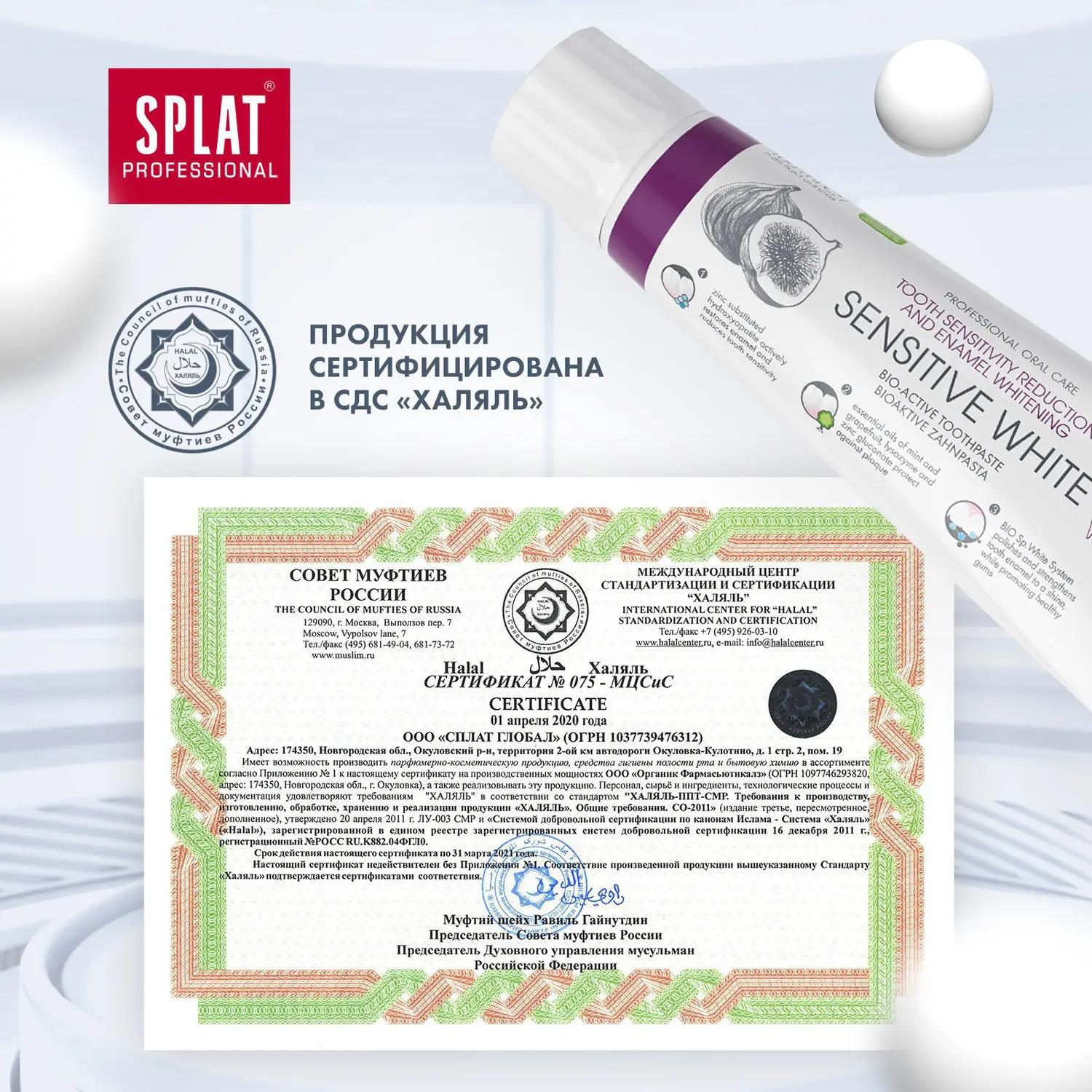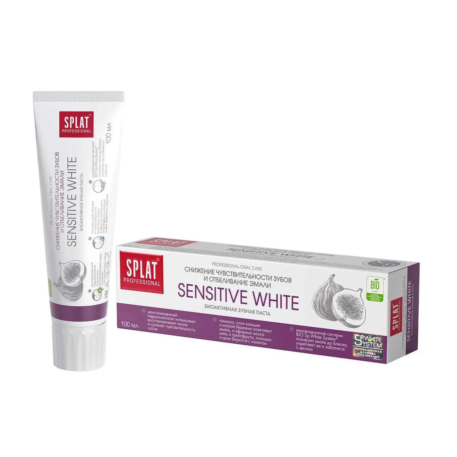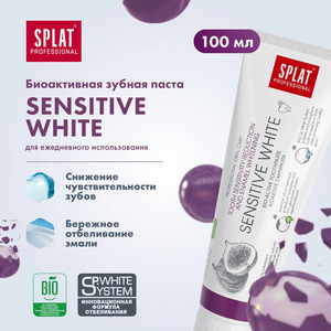 Зубная паста SPLAT Professional «Сенситив Отбеливание» (SENSITIVE WHITE) с инновационным комплексом Sp.White System бережно осветляет эмаль чувствительных зубов. Фермент танназа расщепляет окрашенные вещества на эмали. Пирофосфаты кальция и натрия интенсивно счищают налет, а эфирные масла мяты, грейпфрута и глюконат цинка не дают ему вновь образовываться. Экстракт инжира оказывает антиоксидантное и антибактериальное действие. Природный белок лизоцим активно защищает от бактерий. Экстракт бифидобактерий поддерживает баланс микрофлоры в полости рта.Большого тюбика (100 мл) хватит надолго. Рекомендуется взрослым и детям с 14 лет.