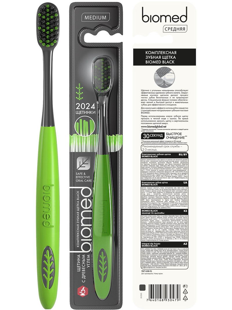 Зубная щетка средней жесткости Biomed Black с угольным напылением на щетине деликатно отбеливает зубы. Закругленные кончики 2024 щетинок бережно очищают эмаль и не травмируют десны. Доступ к дальним жевательным зубам обеспечивает специальная форма головки. Рекомендована к использованию с 14 лет.