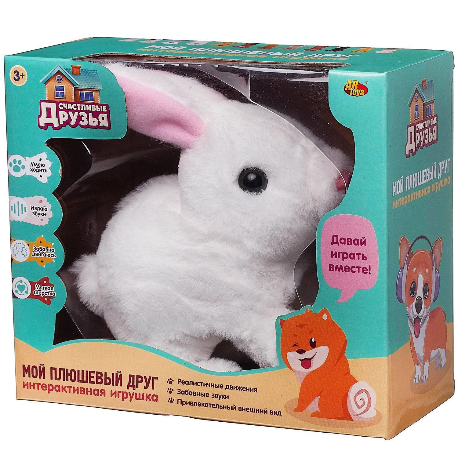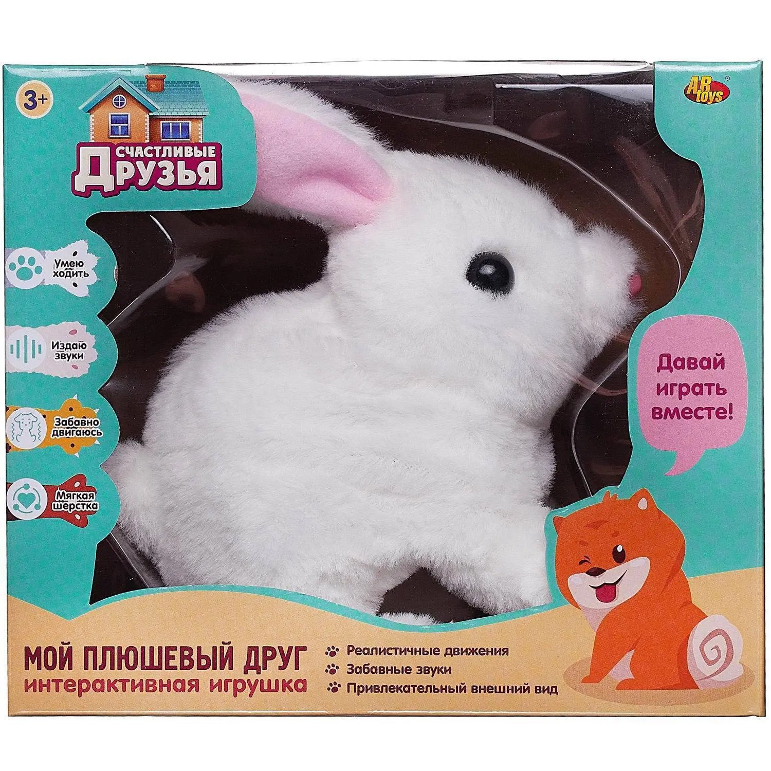 Невероятно очаровательного белого кролика из серии «Счастливые друзья» от бренда Abtoys будет рад получить в подарок каждый ребенок. Кролик интерактивный, умеет прыгать вперед, а потом во время остановки совершенно умилительно шевелит носиком и ушками, издает забавные звуки. Мягкая шерстка кролика очень густая, с ней ему будут не страшны даже самые лютые морозы. Его круглые глазки – черного цвета, длинные ушки- бело-розовые, носик - розовый. Милая игрушка подарит малышу массу положительных эмоций и поможет научиться заботиться о домашнем любимце.Размер кролика (дхшхв): 18х12,5х15,5 см.