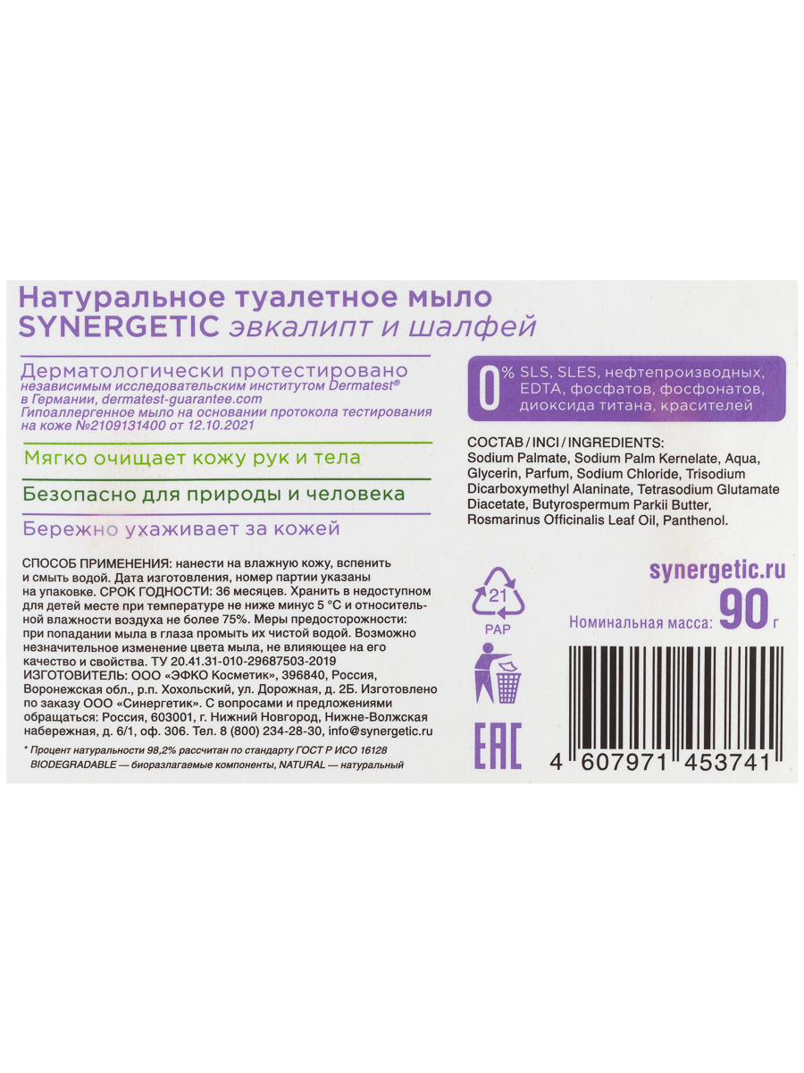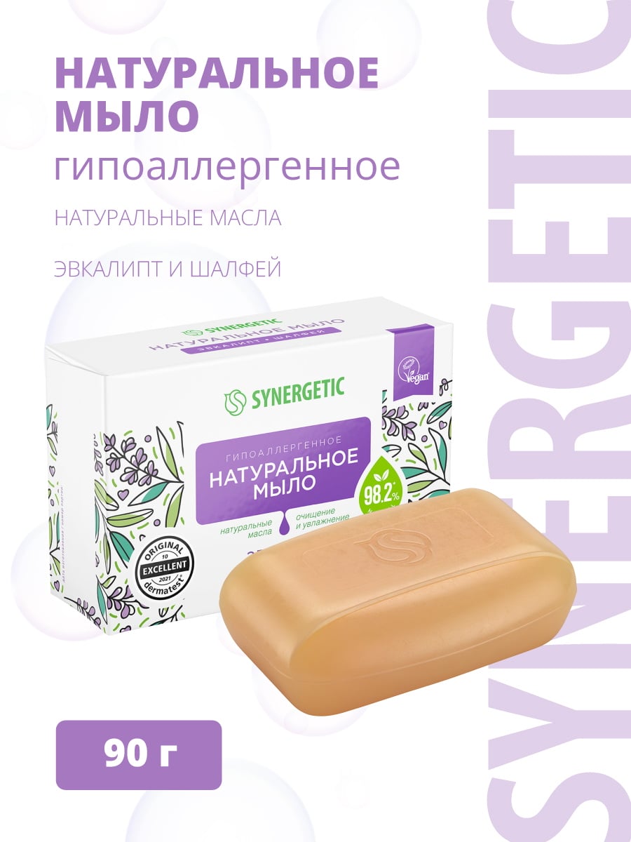 SYNERGETIC Натуральное мыло туалетное "Эвкалипт и шалфей", 90г