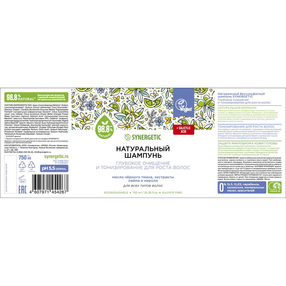 Бессульфатный шампунь SYNERGETIC «Глубокое очищение и тонизирование для роста волос» — эффективное средство для очищения кожи головы и всех типов волос — более чем на 98% состоит из натуральных компонентов.Шампунь комплексно воздействует на волосы и кожу головы и обеспечивает эффективное очищение. Формула с салициловой кислотой и кофеином оказывает деликатное отшелушивающее действие даже после агрессивных загрязнений и интенсивно питает поврежденные волосы, делая их мягкими и эластичными.