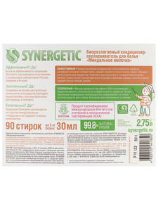 Гипоаллергенный кондиционер-ополаскиватель для белья SYNERGETIC «Миндальное молочко» – высокоэффективное средство, бережно ухаживающее за всеми типами ткани и придающее особую мягкость белью после стирки.Обладает антистатическим эффектом. Комплекс растительных К-тензидов обеспечивает легкую глажку белья. Гипоаллергенная отдушка с маслами корицы, сантала и аниса придаёт белью нежный аромат. Подходит для ручной и машинной стирки, полностью выполаскивается из тканей. Международный экологический сертификат ICEA подтверждает биоразлагаемость, безопасность и эффективность средства. Гипоаллергенный кондиционер-ополаскиватель нейтрализует остатки средств для стирки на тканях. Безопасен для септических установок.