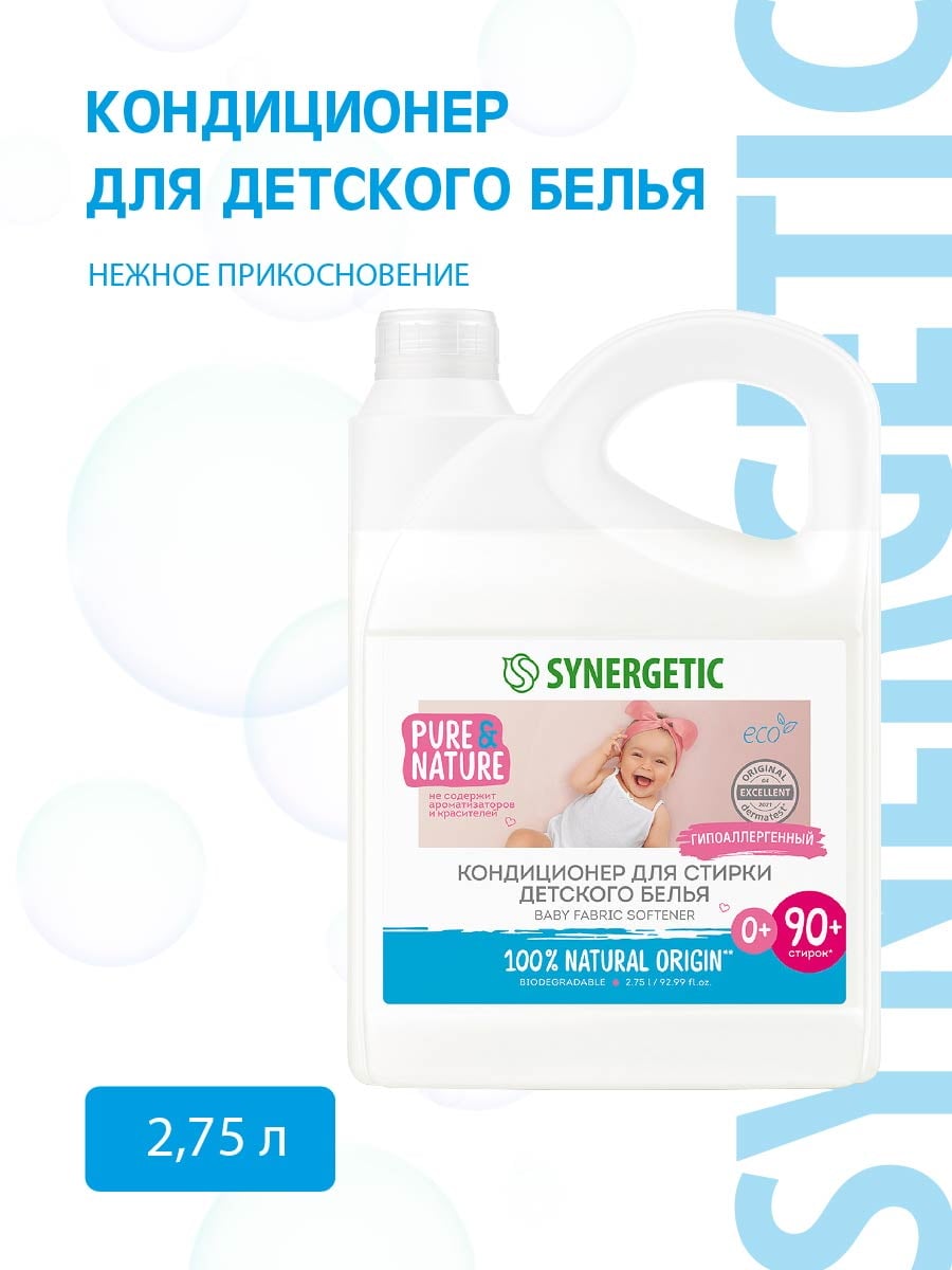 Гипоаллергенный кондиционер-ополаскиватель для детского белья SYNERGETIC «Нежное прикосновение» – высокоэффективное средство, бережно ухаживающее за всеми типами ткани и придающее особую мягкость белью после стирки. Безопасен для белья новорожденных 0+ и одежды людей с чувствительной кожей. Дерматологически протестирован в Европе.Обладает антистатическим эффектом. Комплекс растительных К-тензидов обеспечивает легкую глажку белья. НЕ СОДЕРЖИТ АРОМАТИЗАТОРОВ И КРАСИТЕЛЕЙ. Подходит для ручной и машинной стирки, полностью выполаскивается из тканей. Международный экологический сертификат ICEA подтверждает биоразлагаемость, безопасность и эффективность средства. Гипоаллергенный кондиционер-ополаскиватель нейтрализует остатки средств для стирки на тканях. Безопасен для септических установок.