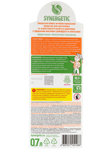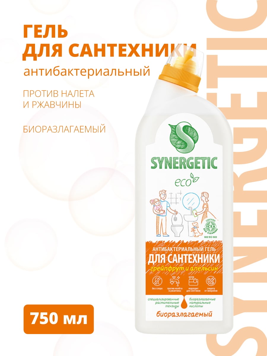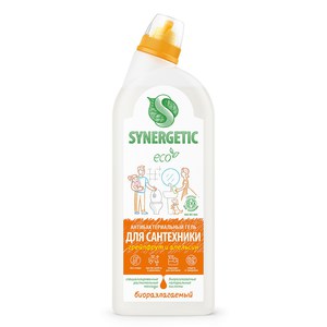 Концентрированное биоразлагаемое средство для мытья сантехники SYNERGETIC «Грейпфрут и апельсин» – универсальное чистящее средство для ежедневной уборки поверхностей, устойчивых к кислотным моющим средствам, в ванных комнатах и санузлах: унитаза, раковины, ванны, душевой кабины, керамической плитки, акриловых, фаянсовых и эмалированных поверхностей. Комплекс натуральных кислот (лимонной, гликолевой и молочной) и Н-тензидов, полученных из растительного масла, устраняет известковый налёт, ржавчину, камень и минеральные загрязнения даже в холодной и жесткой воде. Средство с антибактериальным эффектом убивает микробы и бактерии, а также эффективно устраняет неприятные запахи. Гипоаллергенная отдушка с маслами грейпфрута, апельсина, померанца и мандарина оставляет свежий аромат. Международный сертификат ICEA подтверждает биоразлагаемость, безопасность и эффективность средства. Гель полностью смывается водой, безопасен для септических установок. Не содержит: хлор, фосфаты, оптические отбеливатели, SLS, SLES, агрессивные кислоты и ПАВ.