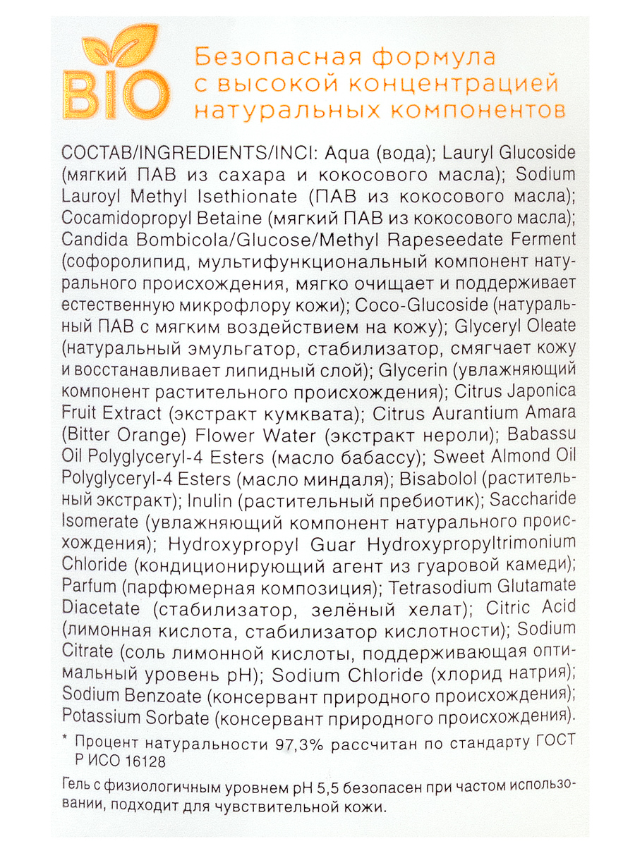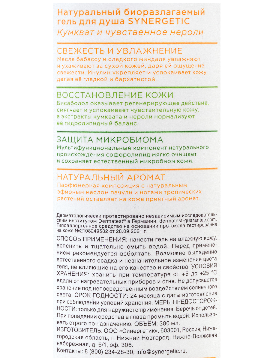 Натуральный биоразлагаемый гель для душа SYNERGETIC «Кумкват и чувственное нероли» — это деликатное средство для очищения кожи, на 99,1% состоящее из натуральных компонентов. Гипоаллергенный аромат геля SYNERGETIC «Кумкват и чувственное нероли» разработан в швейцарском доме Givaudan с маслом пачули и нотами тропических растений. Масла бабассу и сладкого миндаля увлажняют и ухаживают за сухой кожей, даря ощущение свежести. Инулин укрепляет и успокаивает кожу, делая ее гладкой и бархатистой. Софоролипид из рапсового масла мягко очищает и сохраняет естественный микробиом кожи. Бисаболол оказывает регенерирующее действие, смягчает и успокаивает чувствительную кожу, а экстракты кумквата и нероли нормализуют ее гидролипидный баланс. Физиологичный уровень pH 5,5 гарантирует мягкость кожи и безопасность при частом использовании даже для чувствительной кожи. Гель для душа сертифицирован британской организацией The Vegan Society.