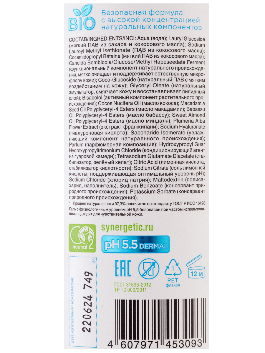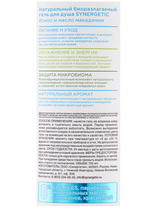 Натуральный биоразлагаемый гель для душа SYNERGETIC «Кокос и масло макадамии» — это деликатное средство для очищения кожи, на 99,1% состоящее из натуральных компонентов. Гипоаллергенный аромат геля SYNERGETIC «Кокос и масло макадамии» разработан в швейцарском доме Givaudan с нотами макадамии и кокоса. Натуральное кокосовое масло питает и ускоряет регенерацию кожи, придавая мягкость и эластичность, а масло макадамии ухаживает за чувствительной кожей. Софоролипид из рапсового масла мягко очищает и сохраняет естественный микробиом кожи. Масла бабассу и сладкого миндаля оказывают регенерирующее действие, питают и увлажняют кожу, делая её гладкой и бархатистой. Экстракт франжипани оказывает тонизирующий эффект. Физиологичный уровень pH 5,5 гарантирует мягкость кожи и безопасность при частом использовании даже для чувствительной кожи. Гель для душа сертифицирован британской организацией The Vegan Society.