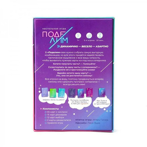 Простая и динамичная игра, в ходе которой игроки пытаются собрать самую выгодную комбинацию карт. В колоде карты от 1 до 10, а главное их кол-во равно номиналу. В игре одна единица, две двойки ... десять десяток и пятнадцать Джокеров, чтобы добавить непредсказуемости каждой партии.Игроки по очереди становятся ведущим и могут по-своему делить ряд из 7 или 9 карт на 3 части, за которые потом будут голосовать все участники. Игрокам достанутся карты только той части, за которую они голосовали единолично, поэтому продвинуться вперед самому или сдержать прогресс соперника - актуальный вопрос каждого раунда. Так мало правил и компонентов в миниатюрной коробочке, но процесса вложено достаточно, чтобы испытать неподдельный азарт и море эмоций!